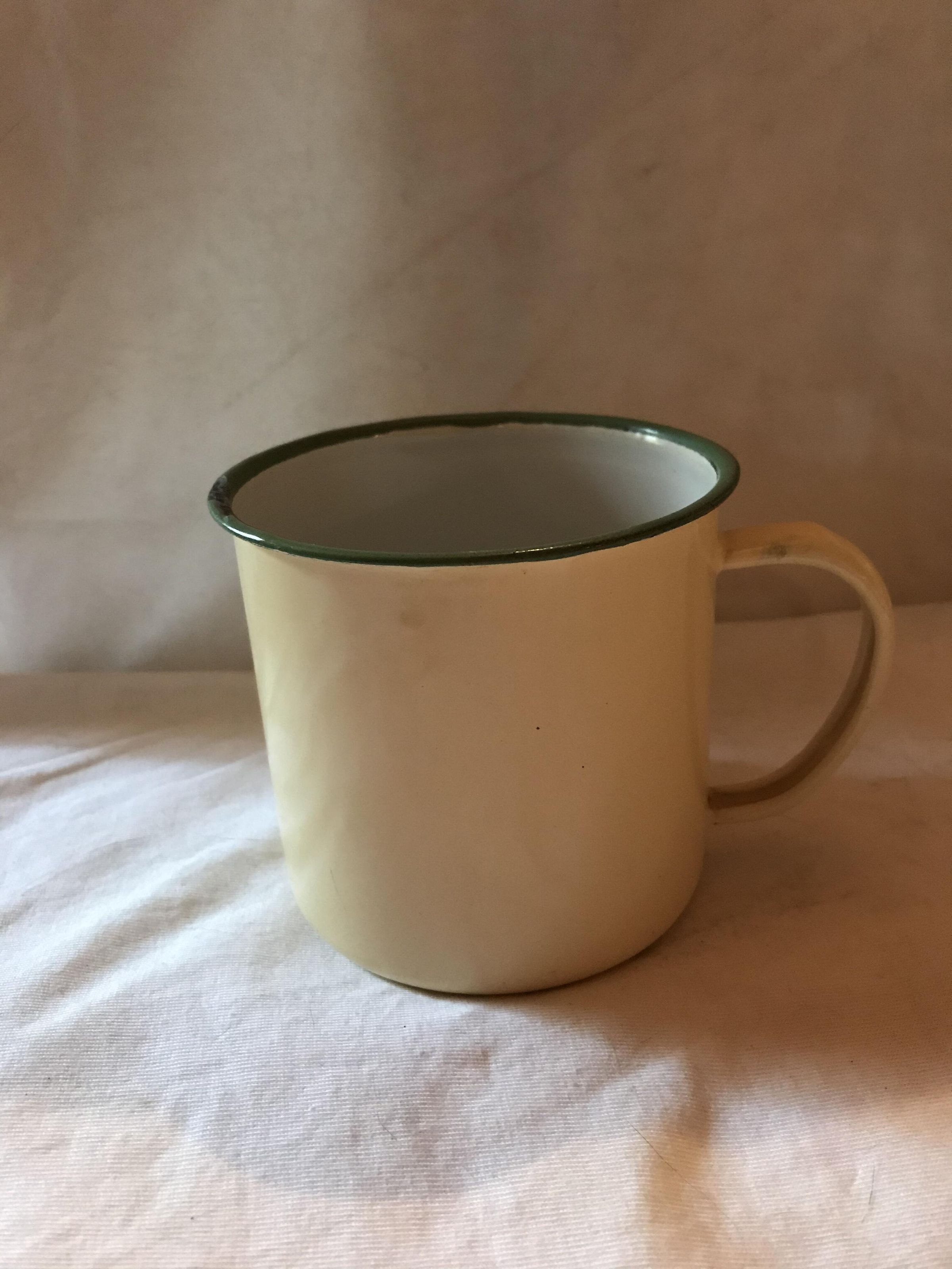 Tin, beige enameled with green rim. Bottom: Made in China.Acquisition