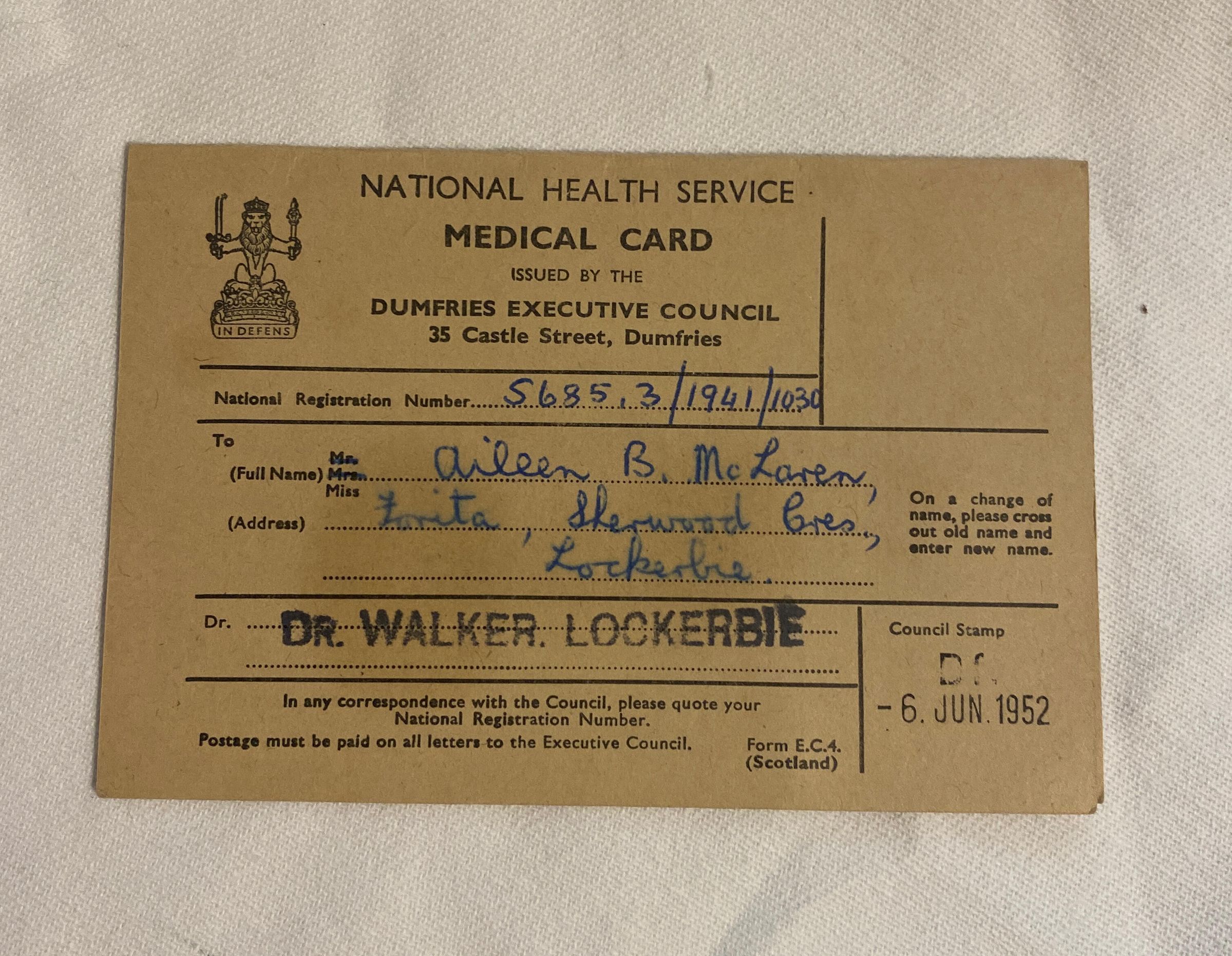 1 folded cardstock booklet of National health service medical card containing information for 'Aileen B McLaren'Acquisition