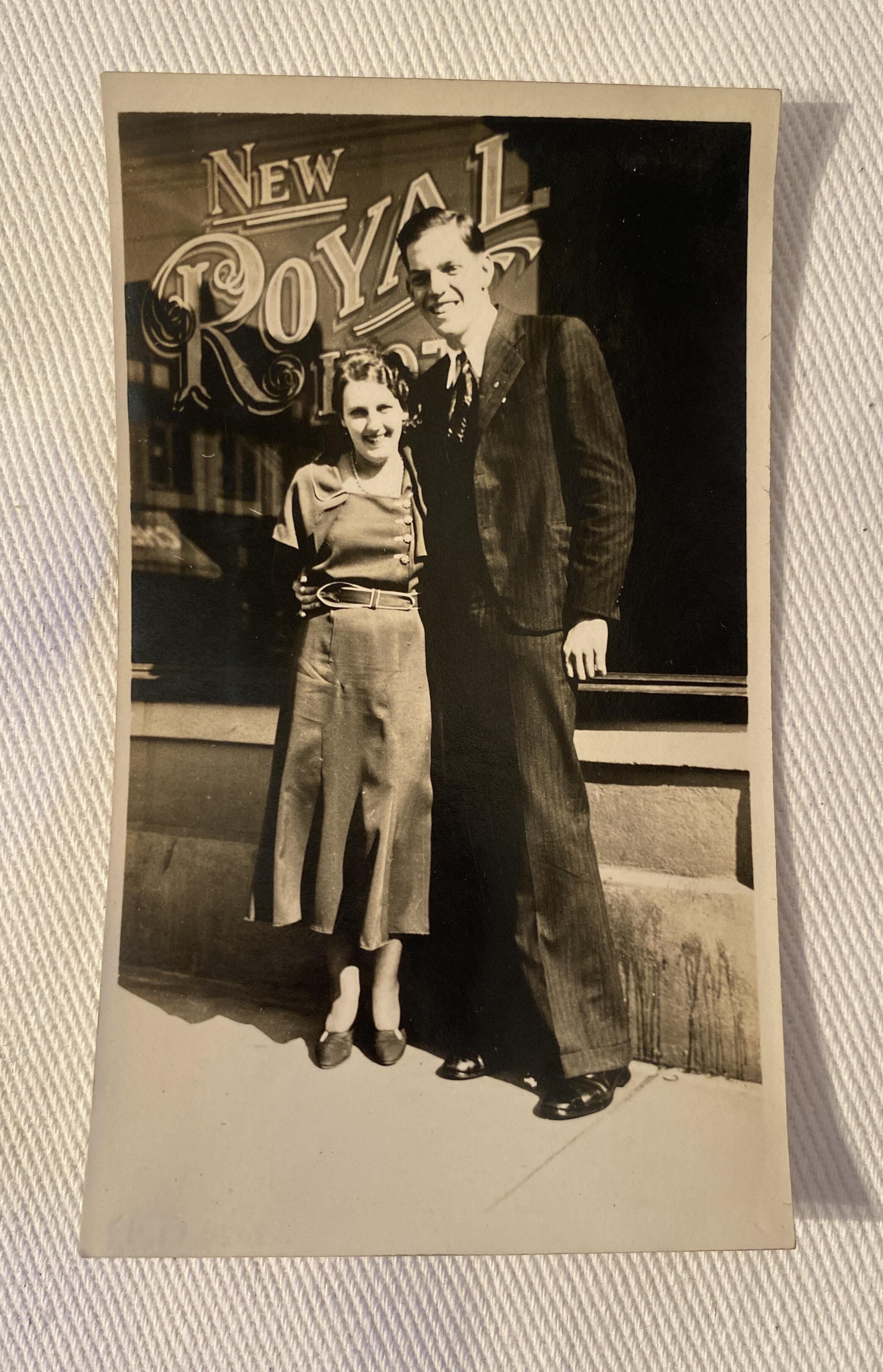 Black and white photograph of a man and woman standing infront of the 'New Royal Hotel' in Prince RupertPhotograph Details