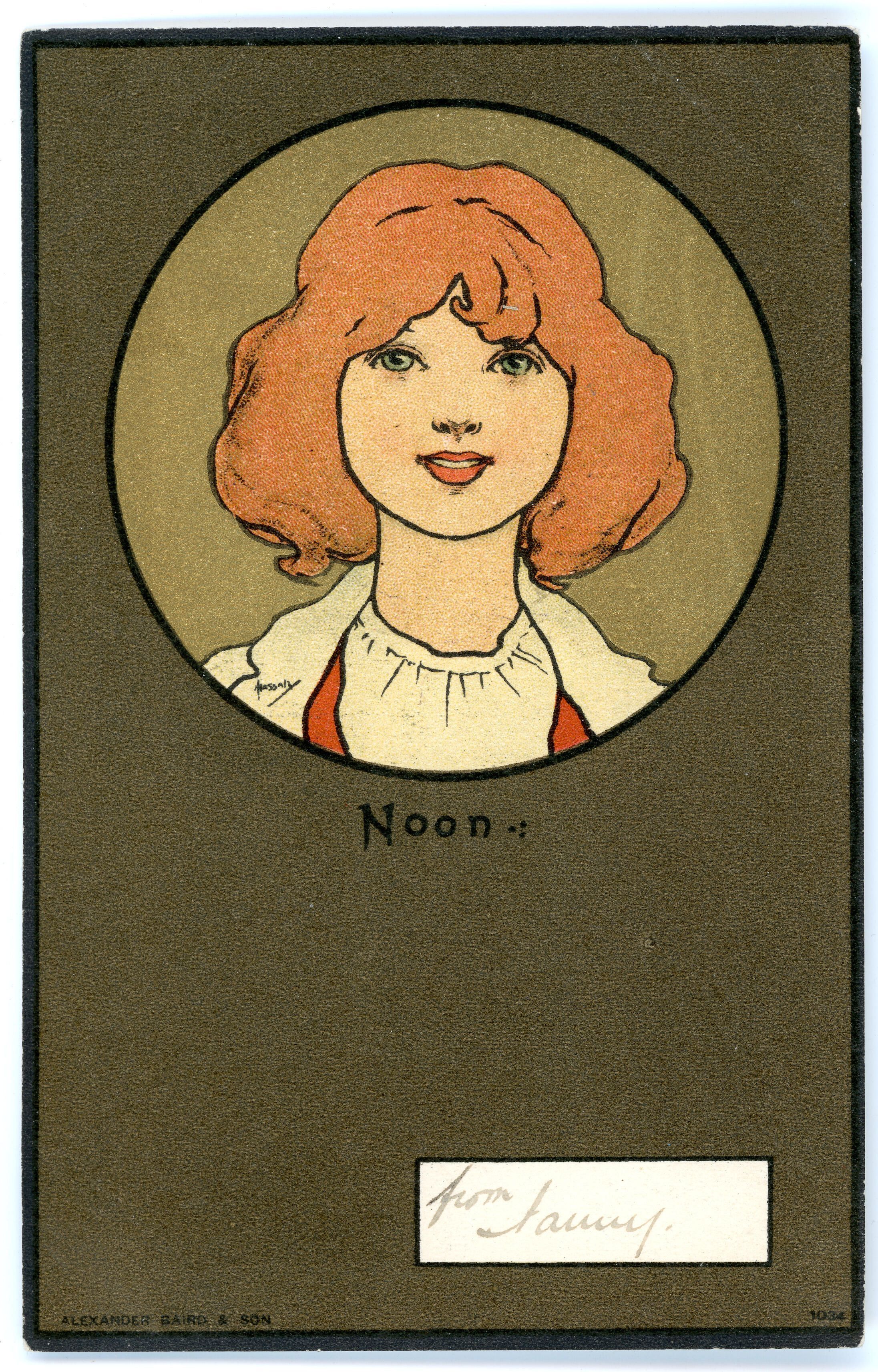 Postcard from 1904 of the face of a young women with red hair with the words noon below her face.Collection