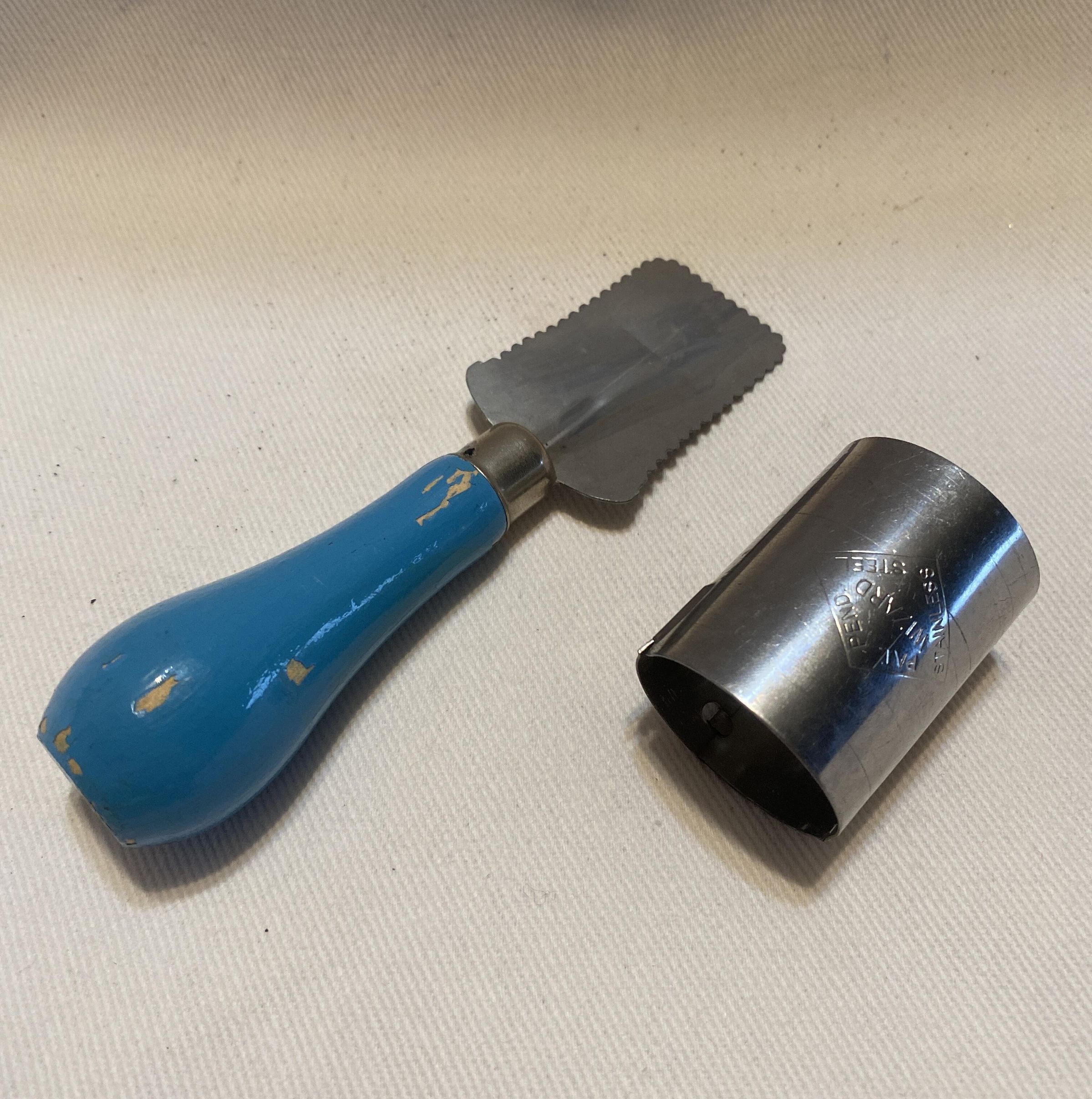 serated rectangular blade attatched to a blue wooden handle. Cylidrical blade cover attatched.