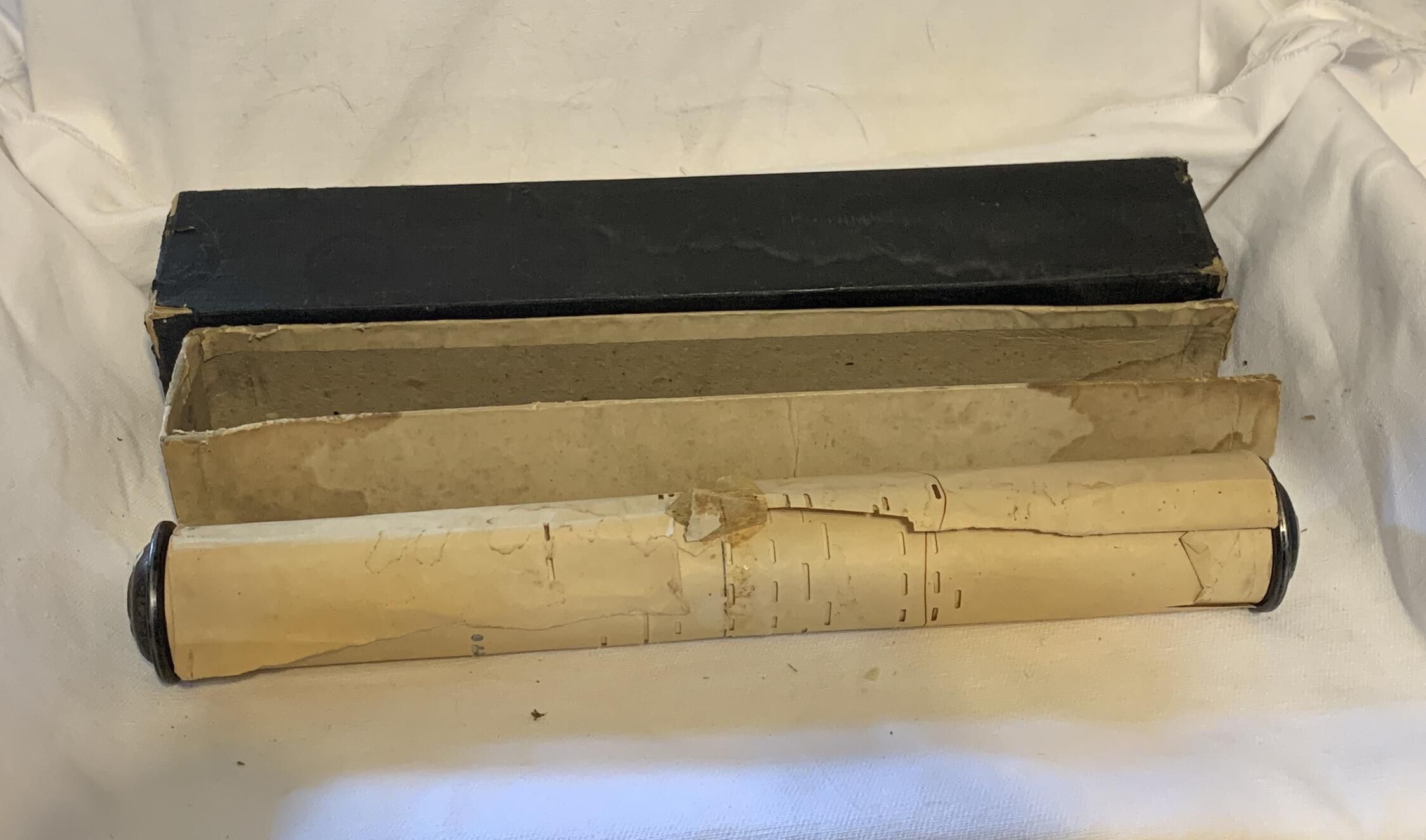stored in a two part box with a black top coverContext