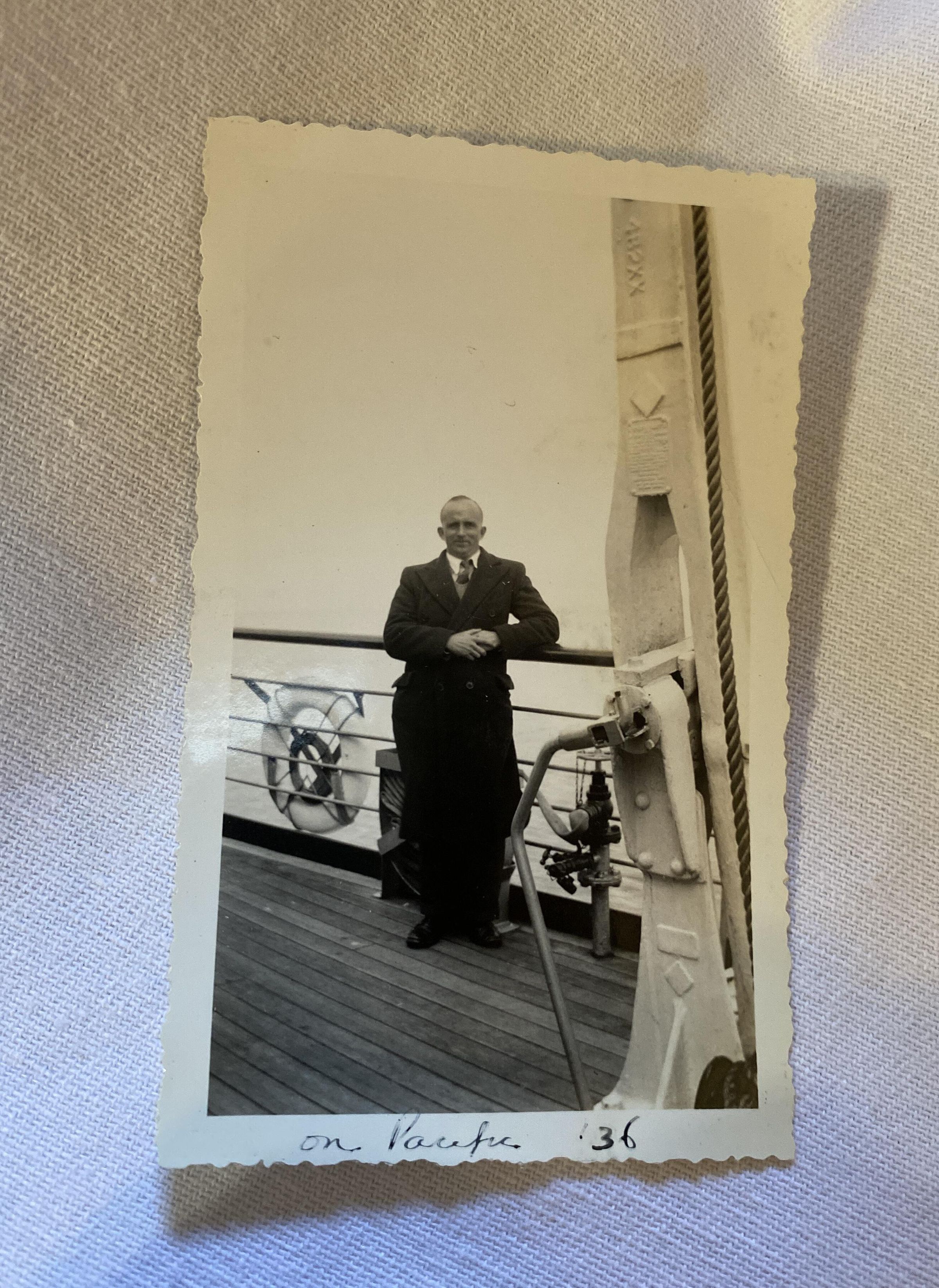 photo shows man standing on boat, 1936Acquisition