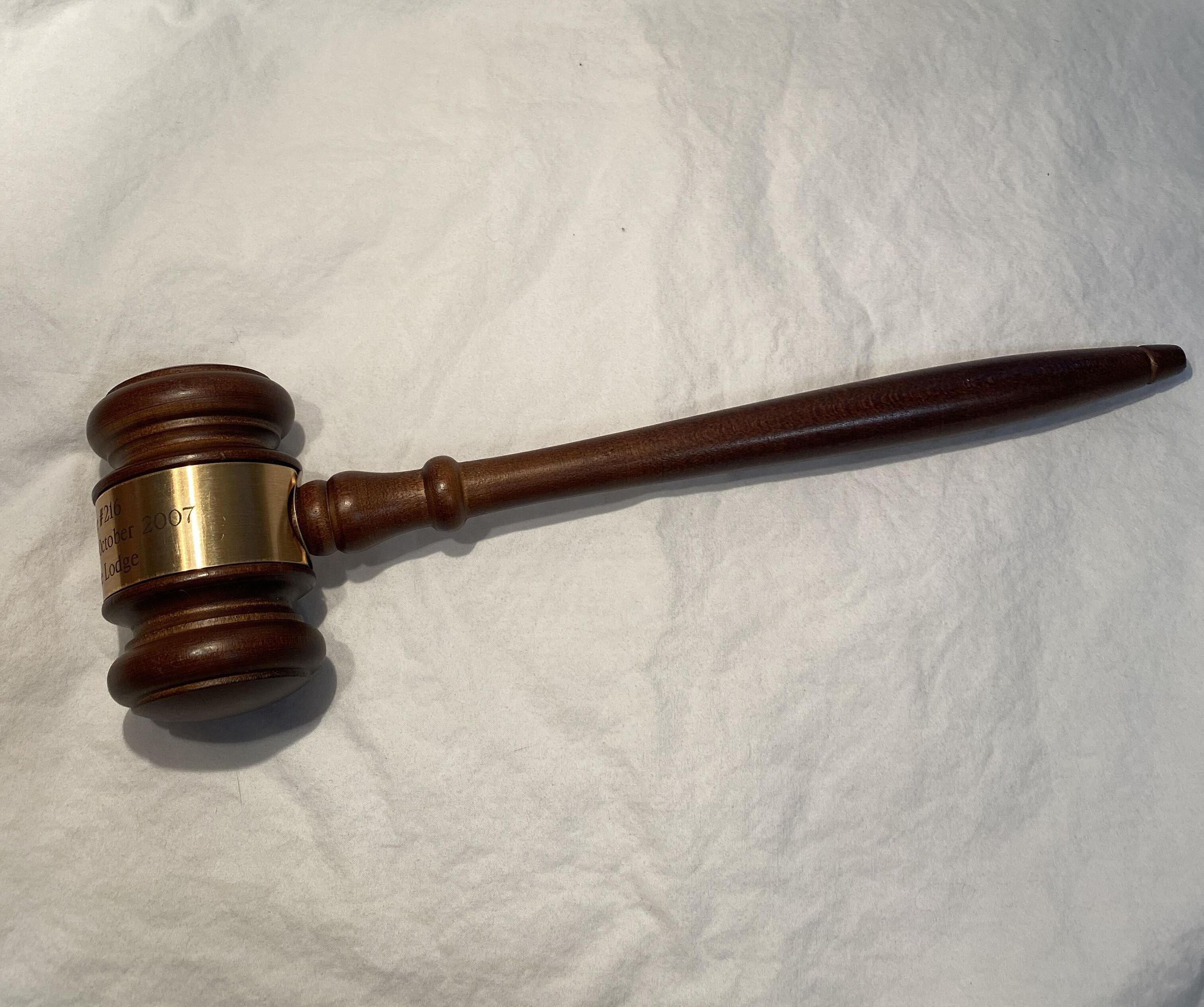 Wooden gavel. Handle is one wooden piece win an indent around the end and bumps closer to the head. The head of the gavel has two large indents on either end. One end of the head has a gold Stamp which shows an elk, a clock and 'Canada' inside a double bordered diamond shape. Around the center of the head is a bronze colored metal piece which is inscribed "Terrace Lodge #216 50th Anniversary - October 2007 From Supreme Lodge"Use