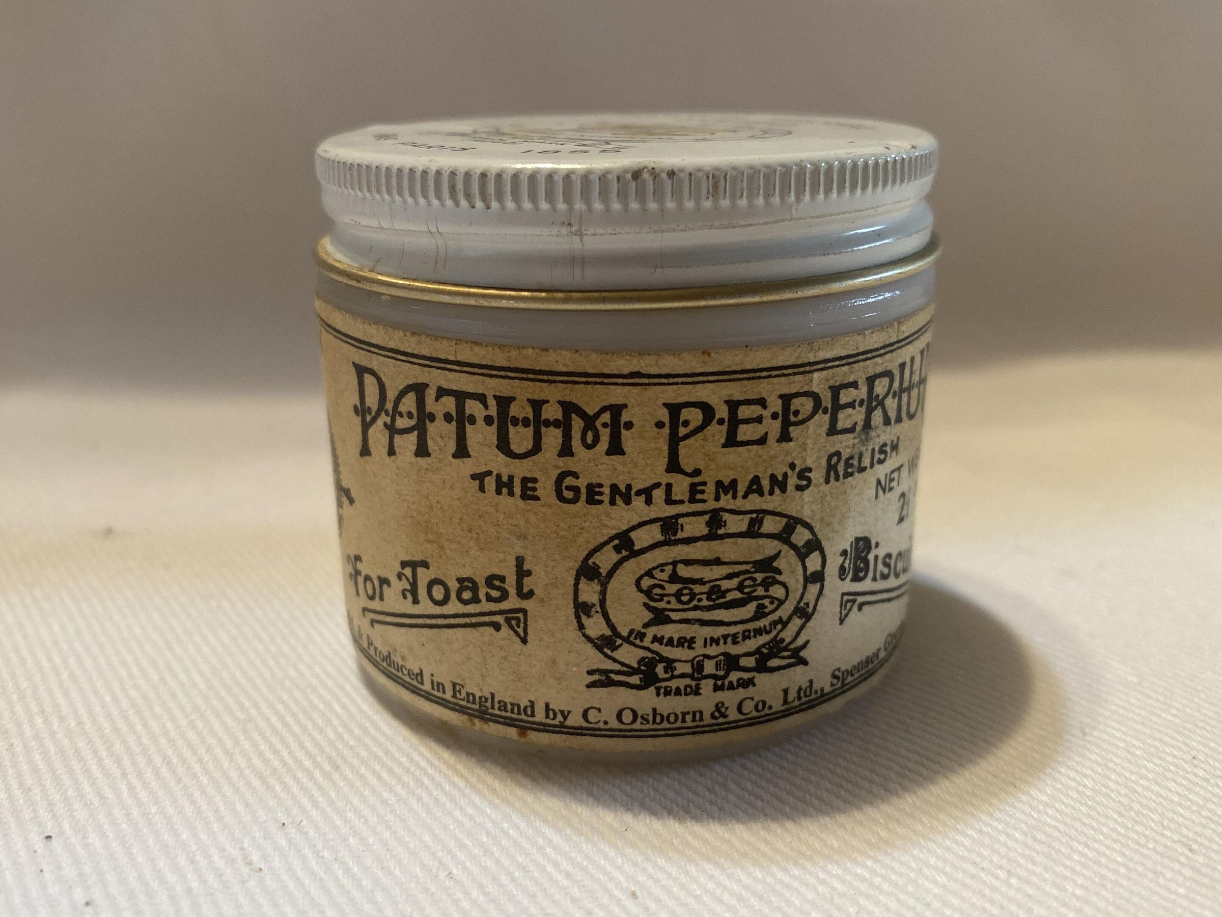 Patum Peperium Relish. Opaque glass jar with white metal srew on lid.