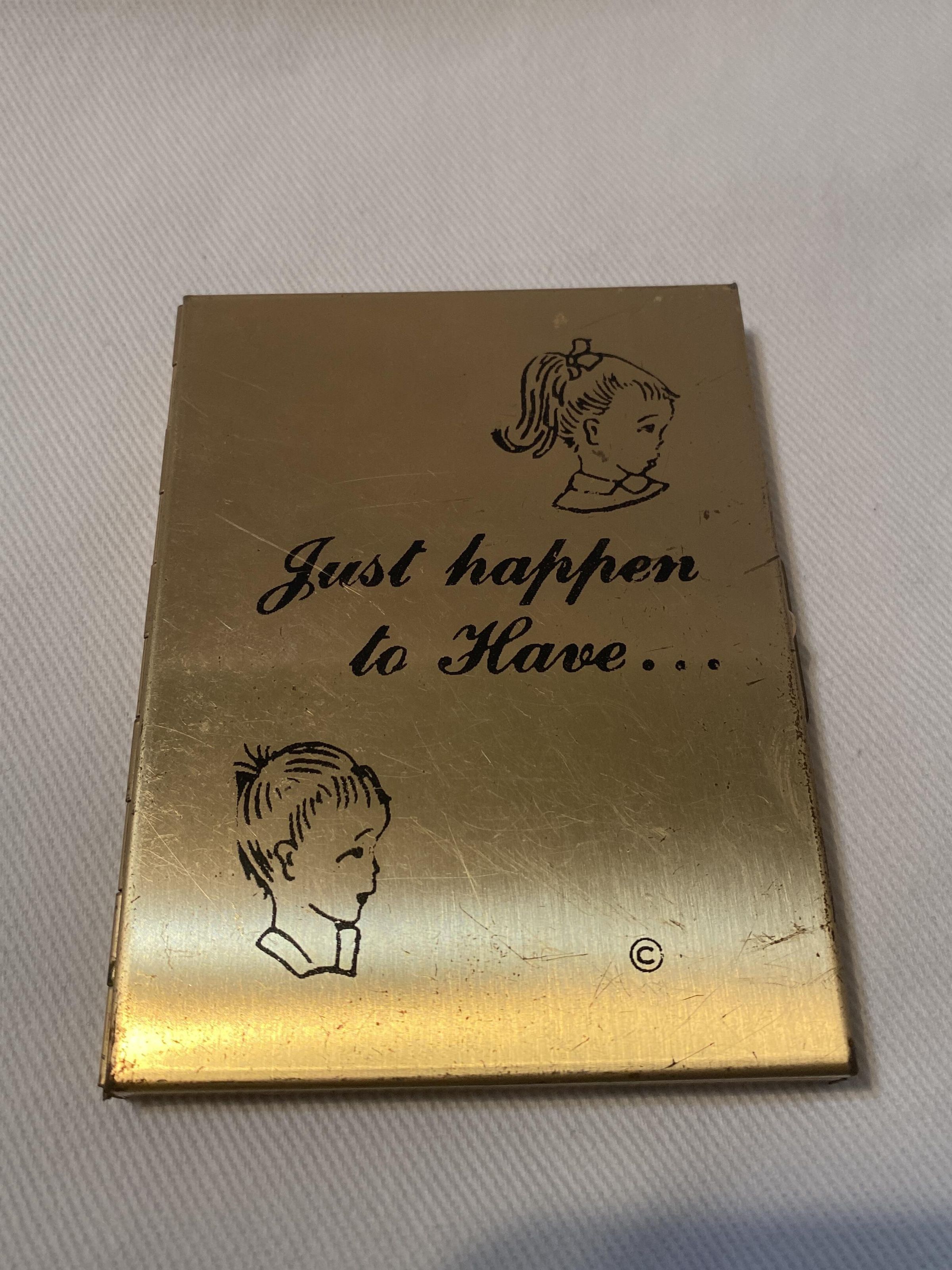 Minature photo album with gold case. Front of cover has a picture of a boy and a girl and the words, "Just happen to Have..."Use