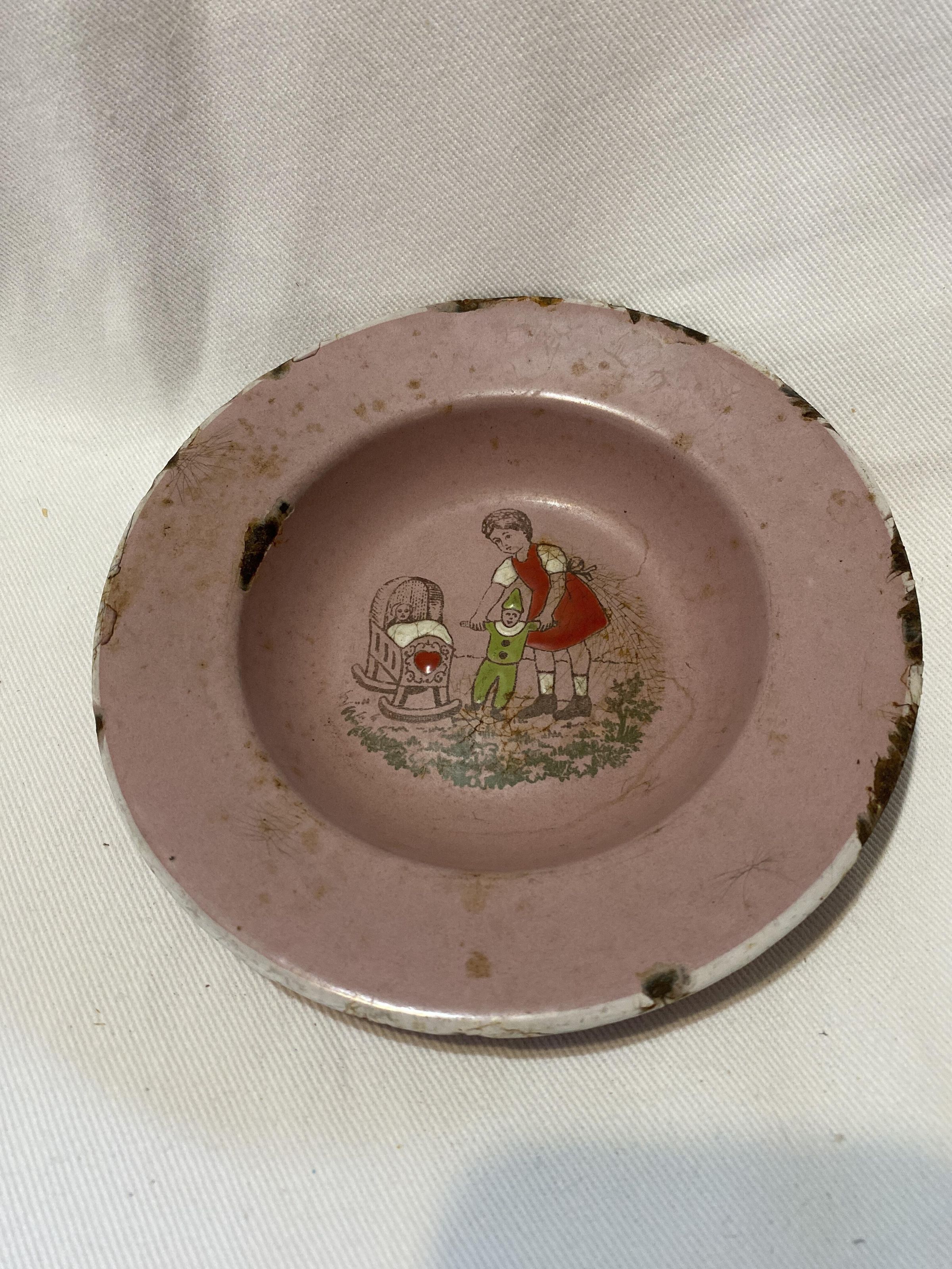 small pink bowl. White rim and central picture of girl playing with dolls