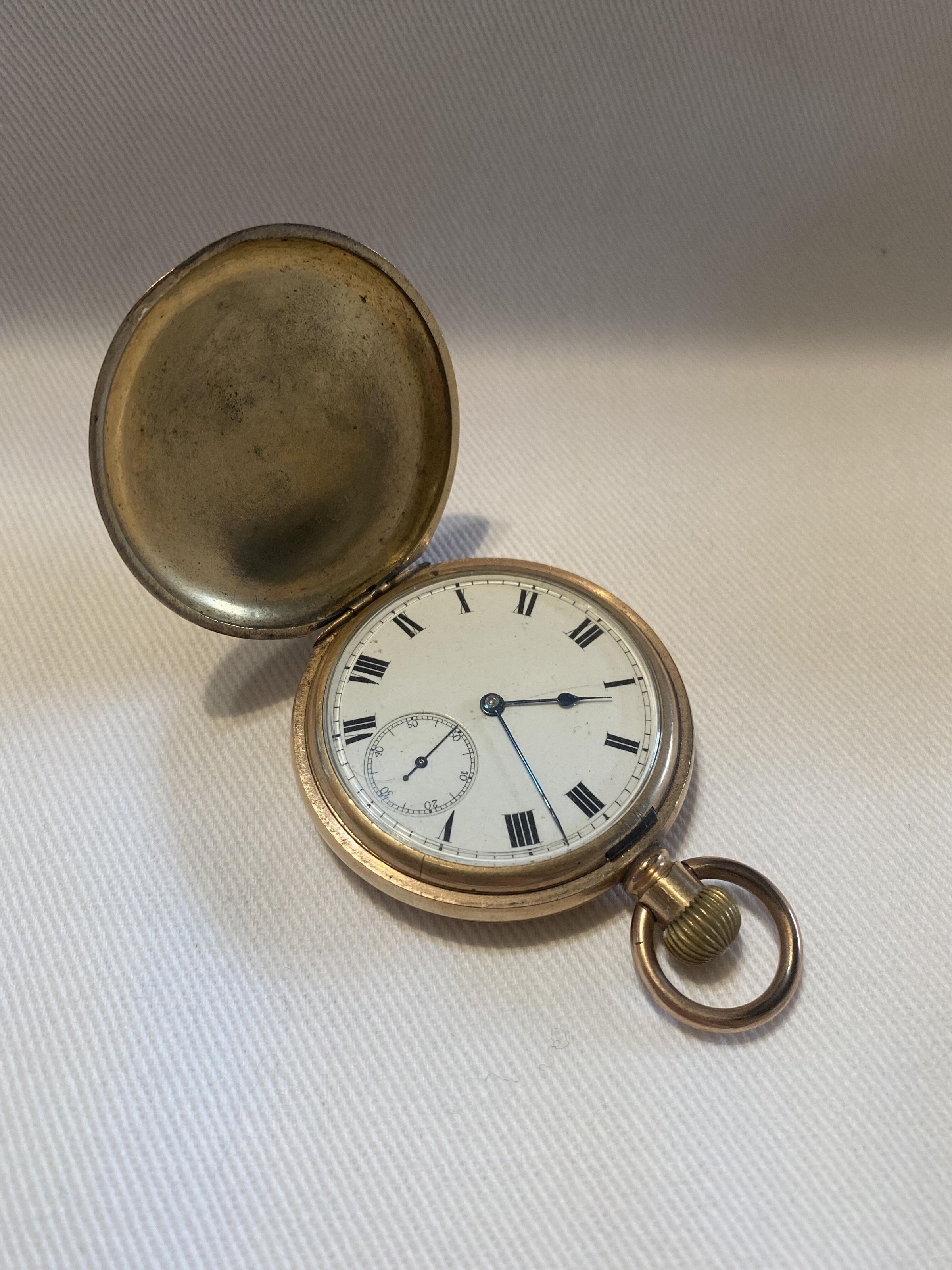 Gold plated man's pocket watch not in working condition. Has a lid that flips open when the knob is pushed.Acquisition
