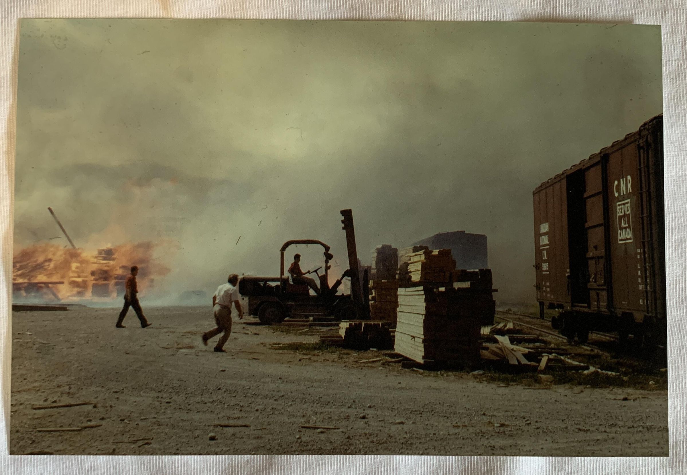 slide of 3 men moving lumber during Pohle's mill fire. Slide, with scan of slide (scan is not an artifact)Acquisition