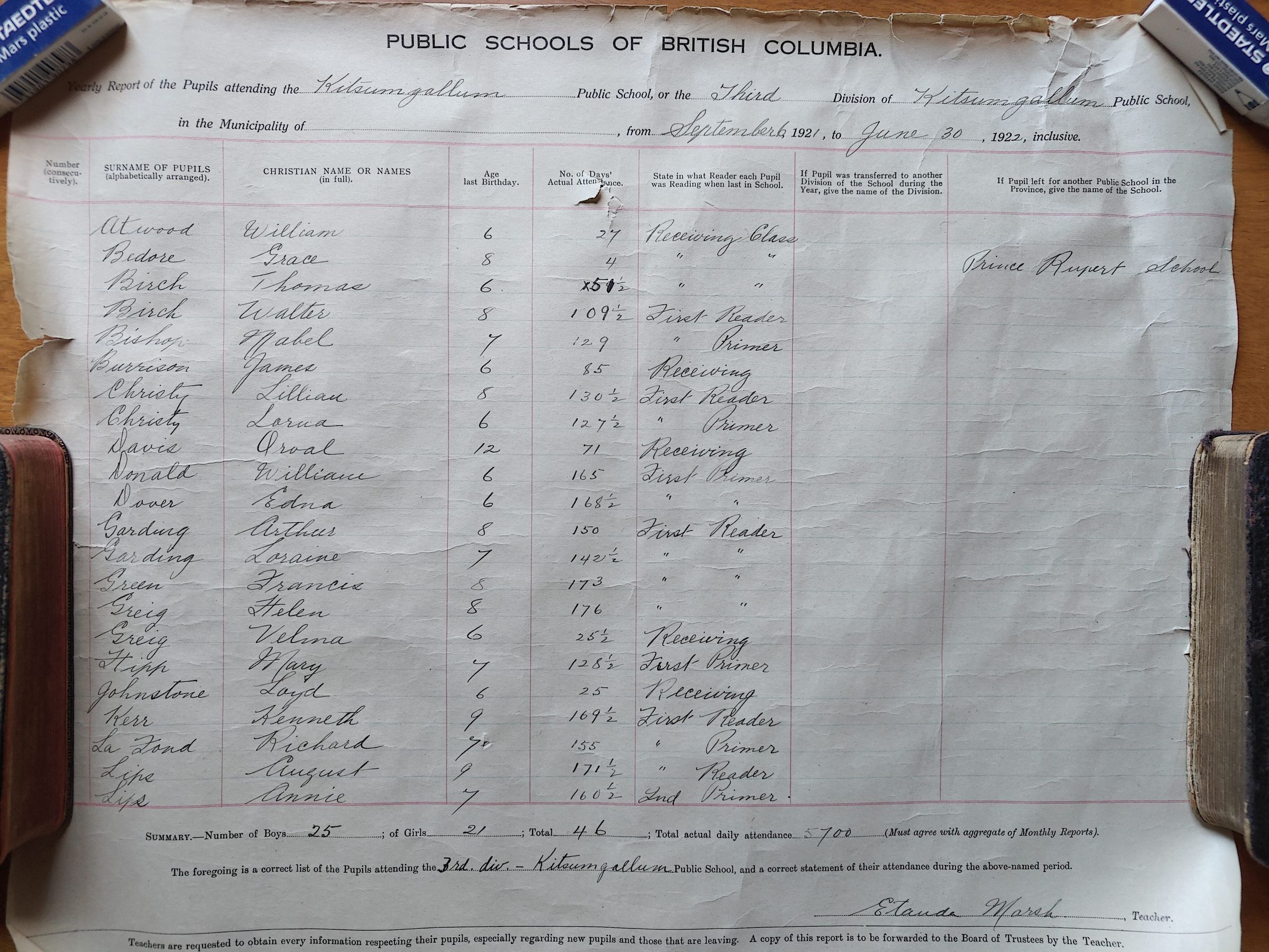 Public Schools of British Columbia - Yearly Report of the Pupils attending the Kitsumgallum Public School, or the Third Division of Kitsumgallum Public School. 1922Description