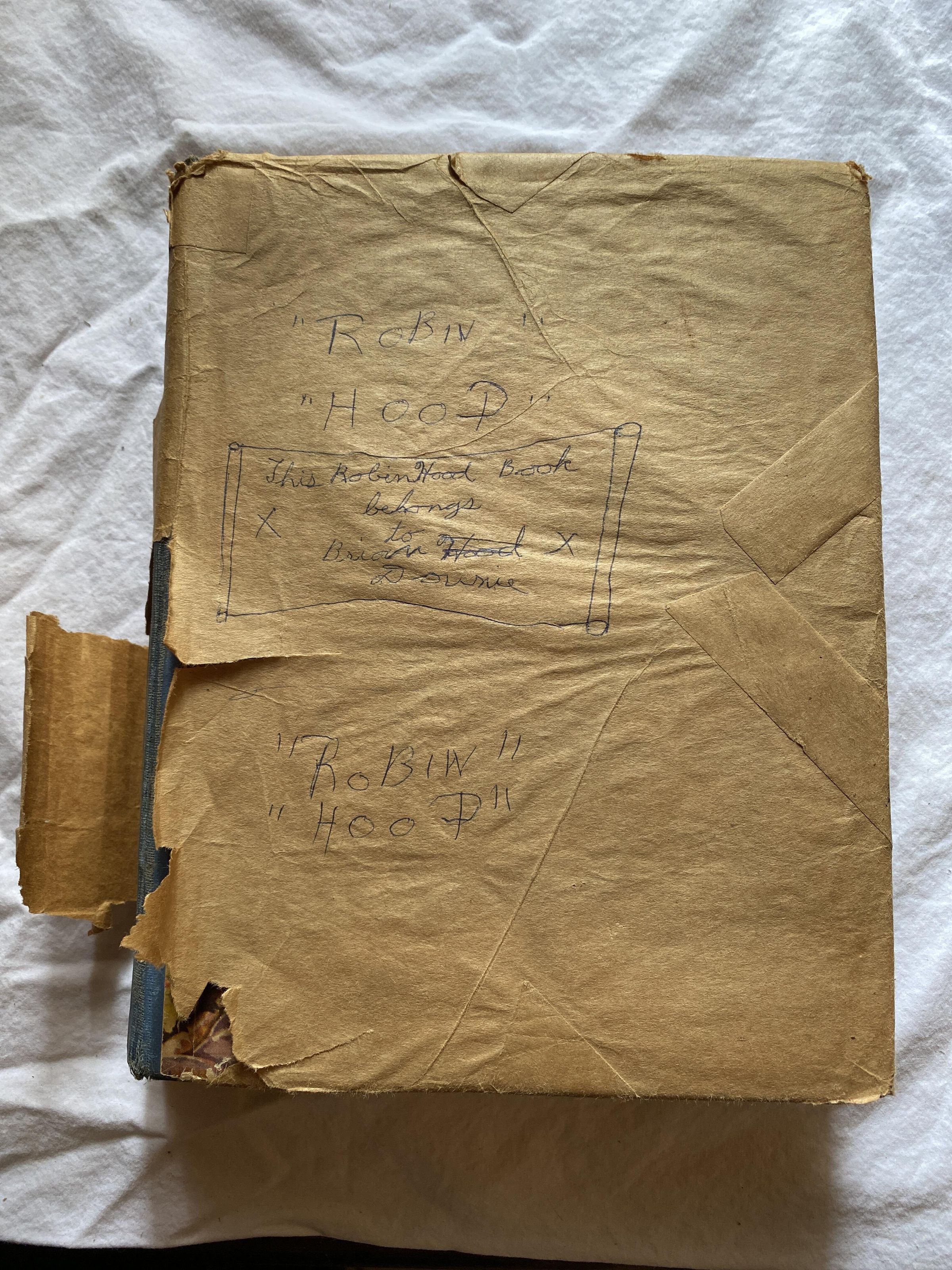 Cover has been covered with brown wrapping paper. The are words written on the brown paper in blue ink say: