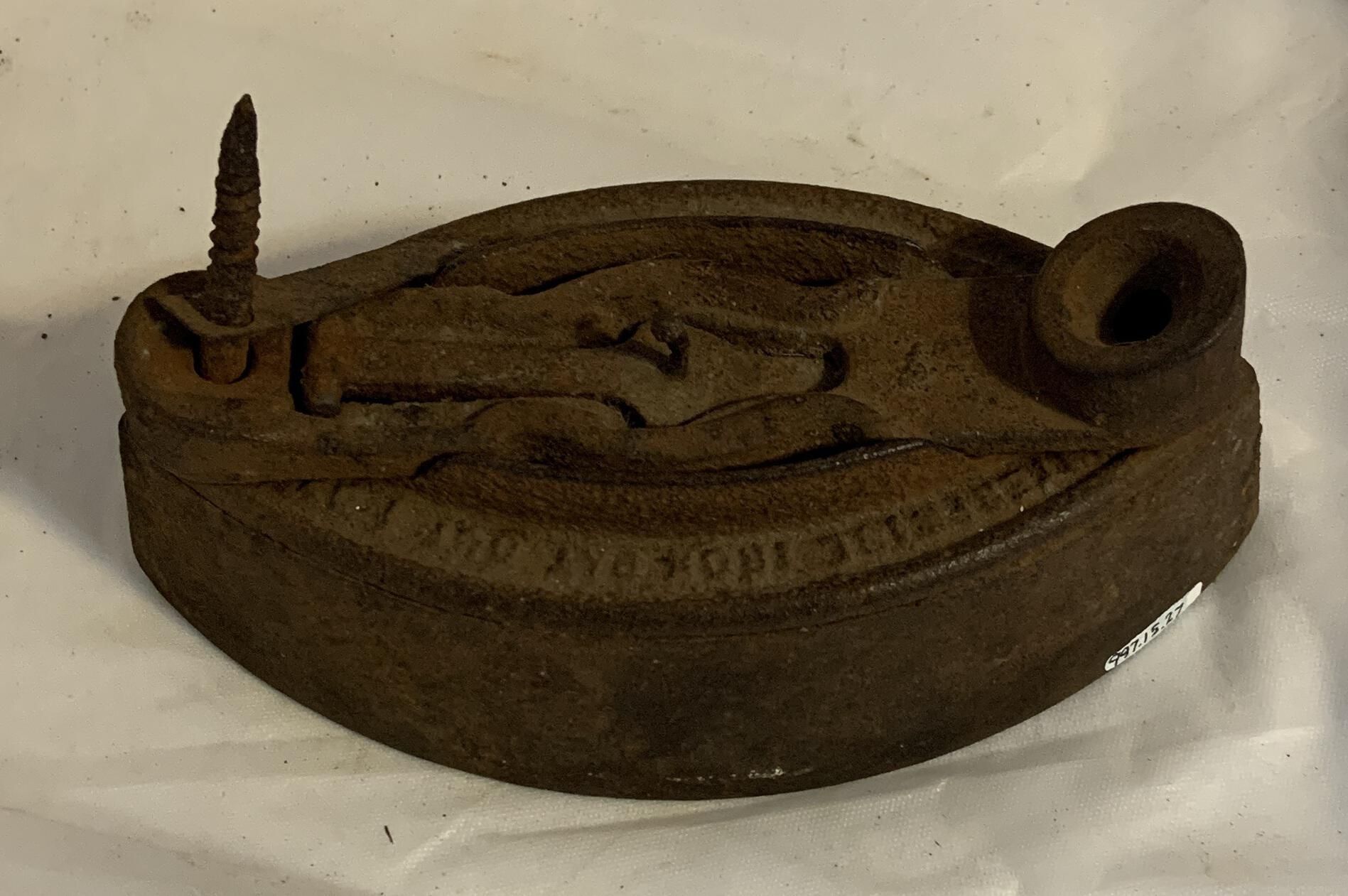 Unreadable name Sad Iron. Bottom with the bottom part of the handle still attached.Acquisition