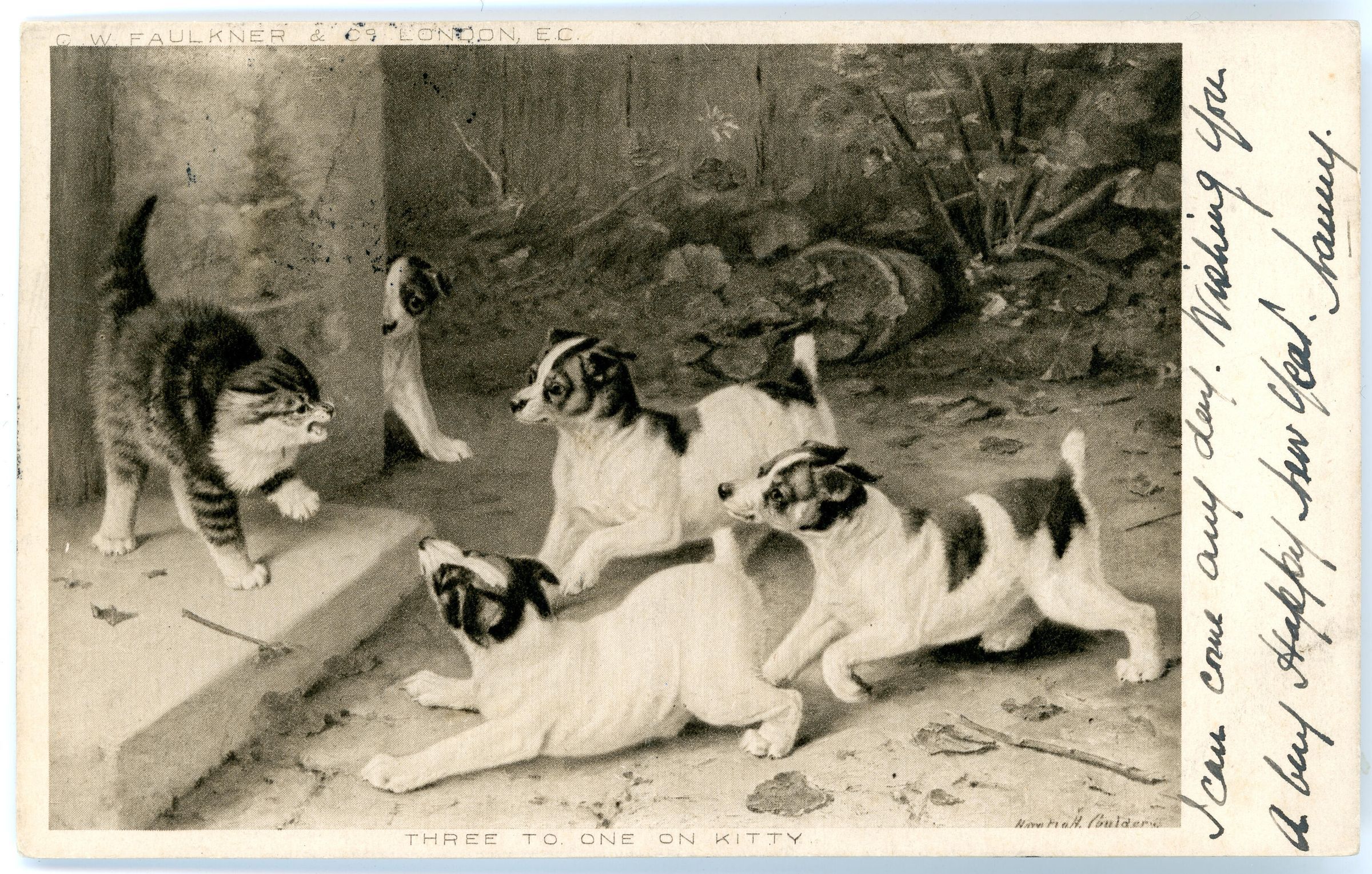 Postcard from 1904 of 3 dogs cornering a catCollection