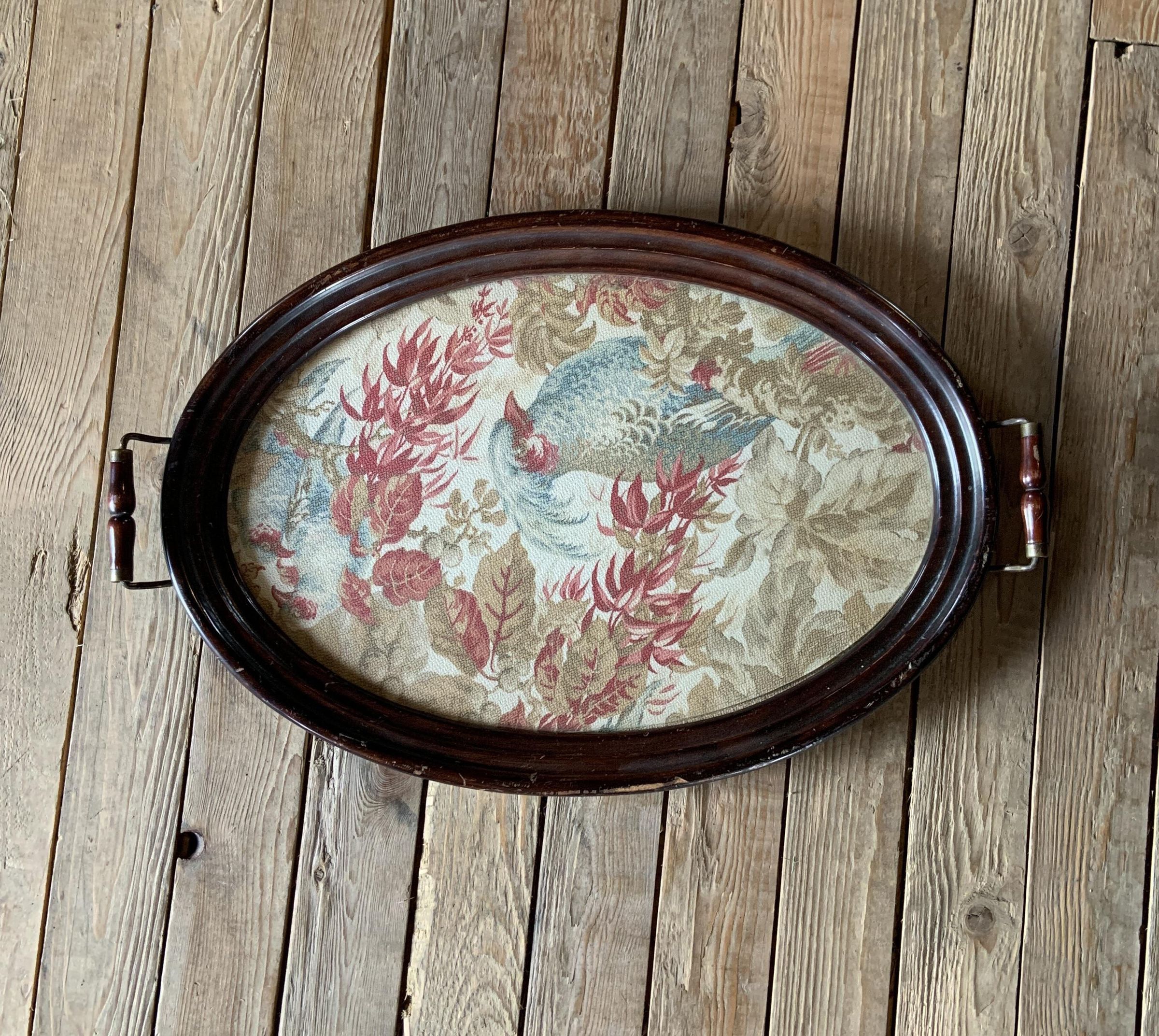 Large wooden serving tray with brown handles, brown bird patternAcquisition