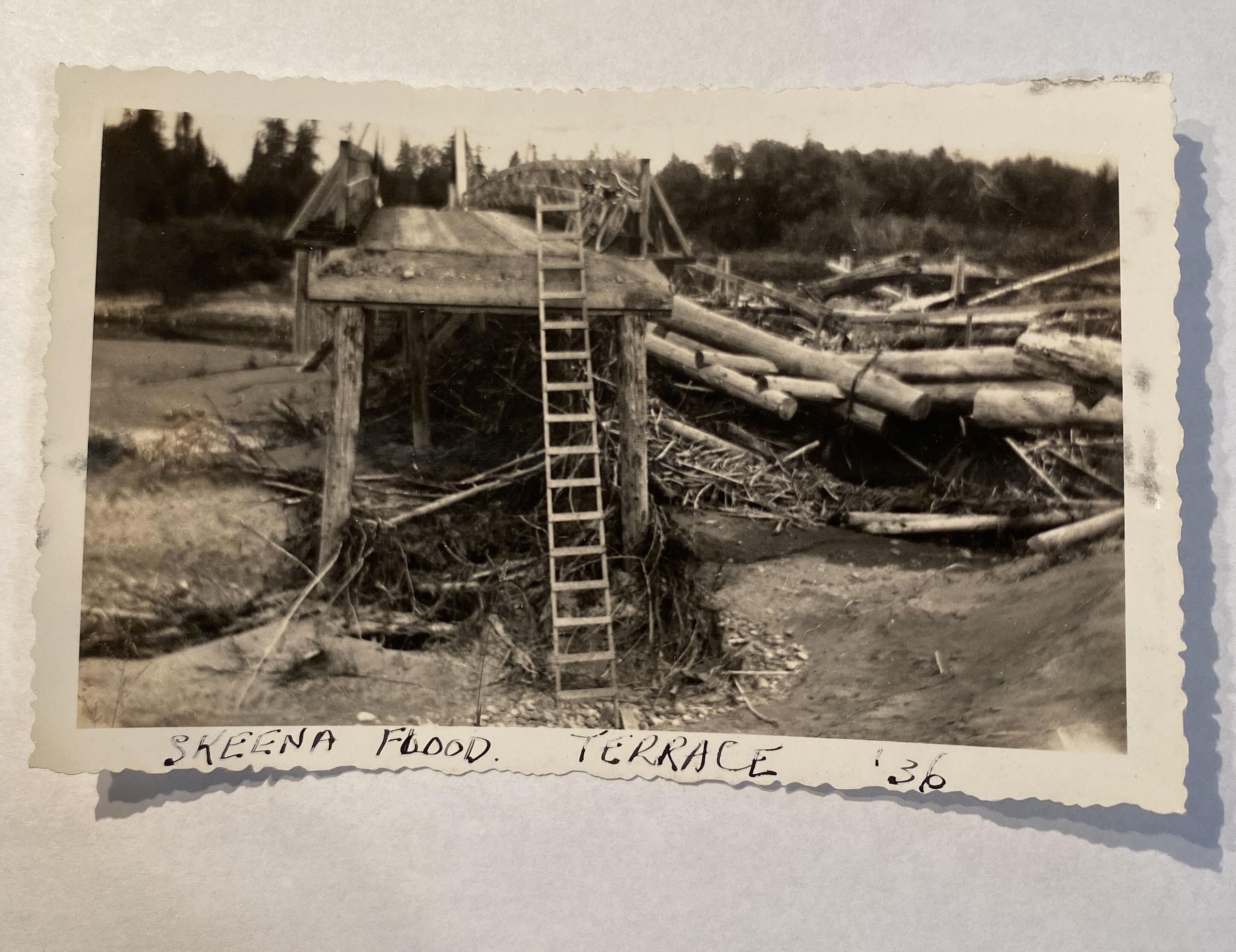 photo shows a buildup of logs and a bridge with a ladder, 1936Photograph Details