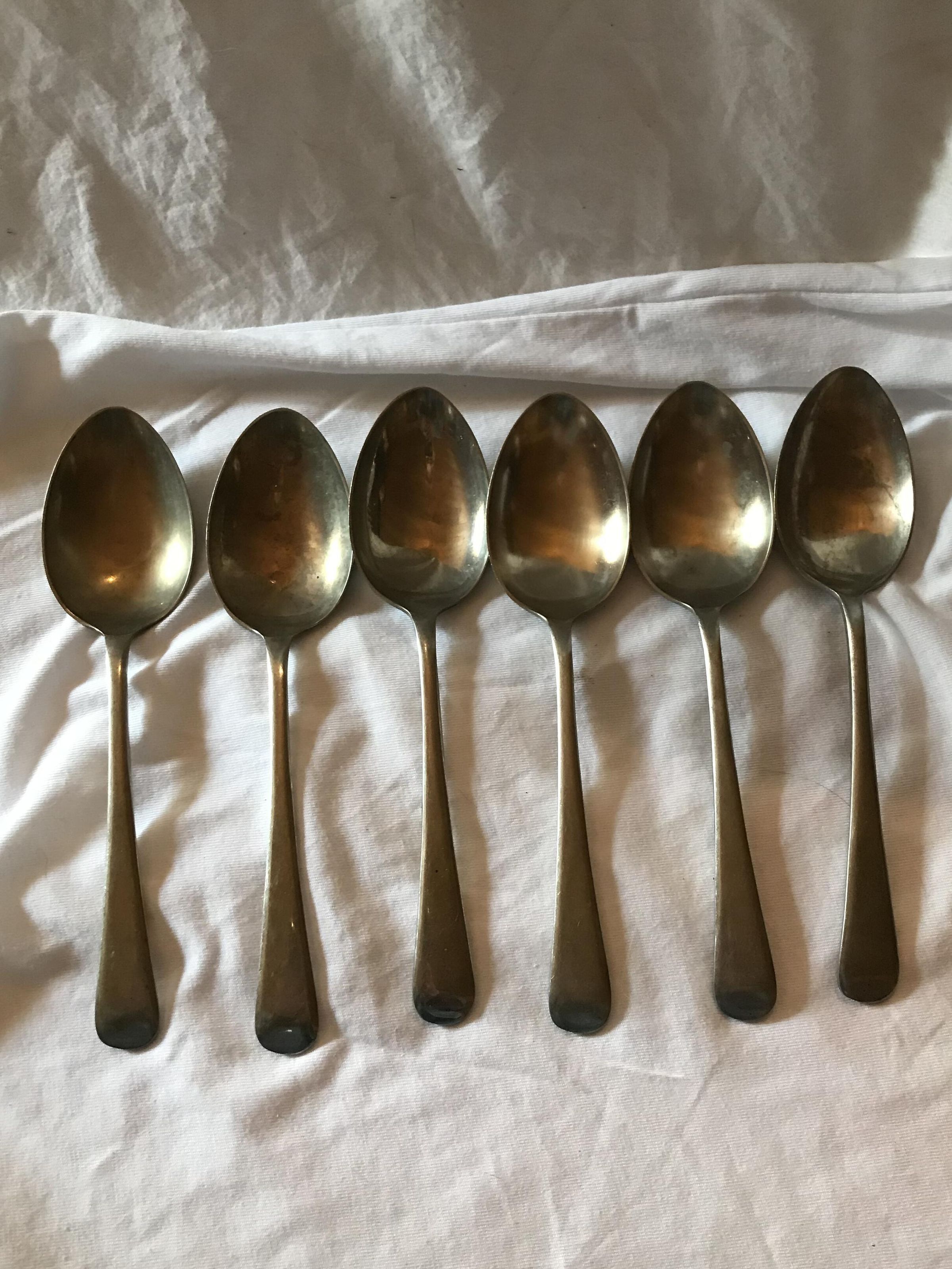 set of 6 spoons ' 'Nickel Silver sheffield england' peak pattern on base back of handleContext