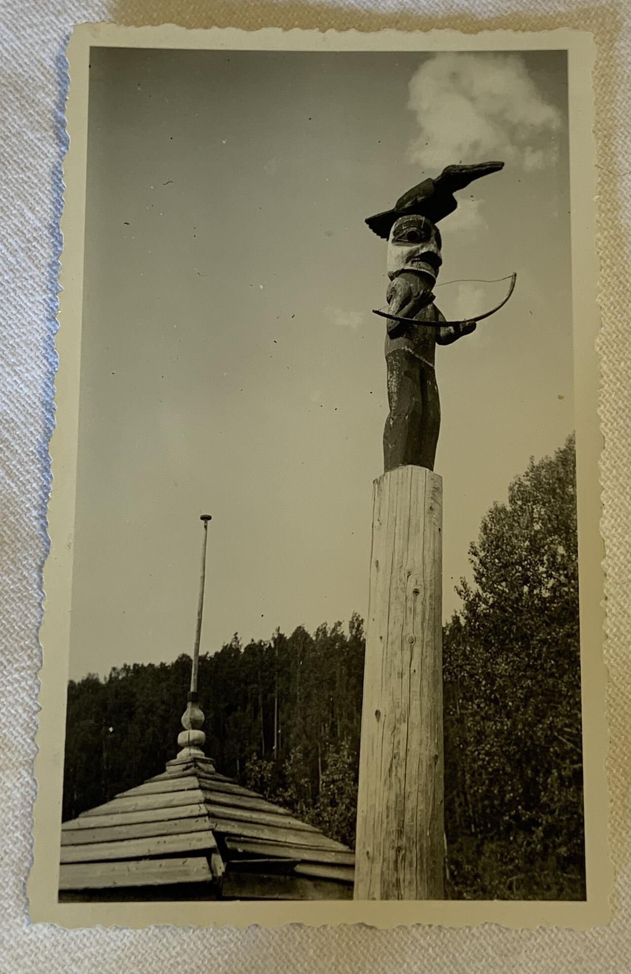Standing close to the C. of E. Church in Kitwancool, one of the poles of Kweenu, June 1944Acquisition