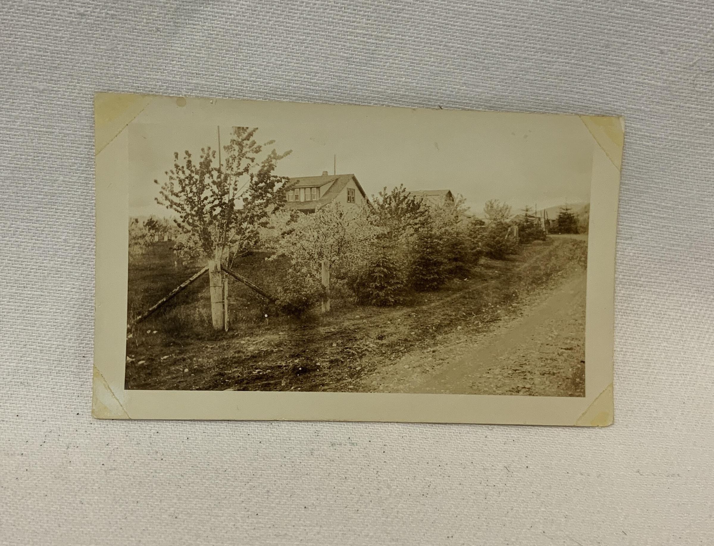 Small sepia tint photograph showing an orchard and road in the foreground and farmhouse in the backgroundPhotograph Details