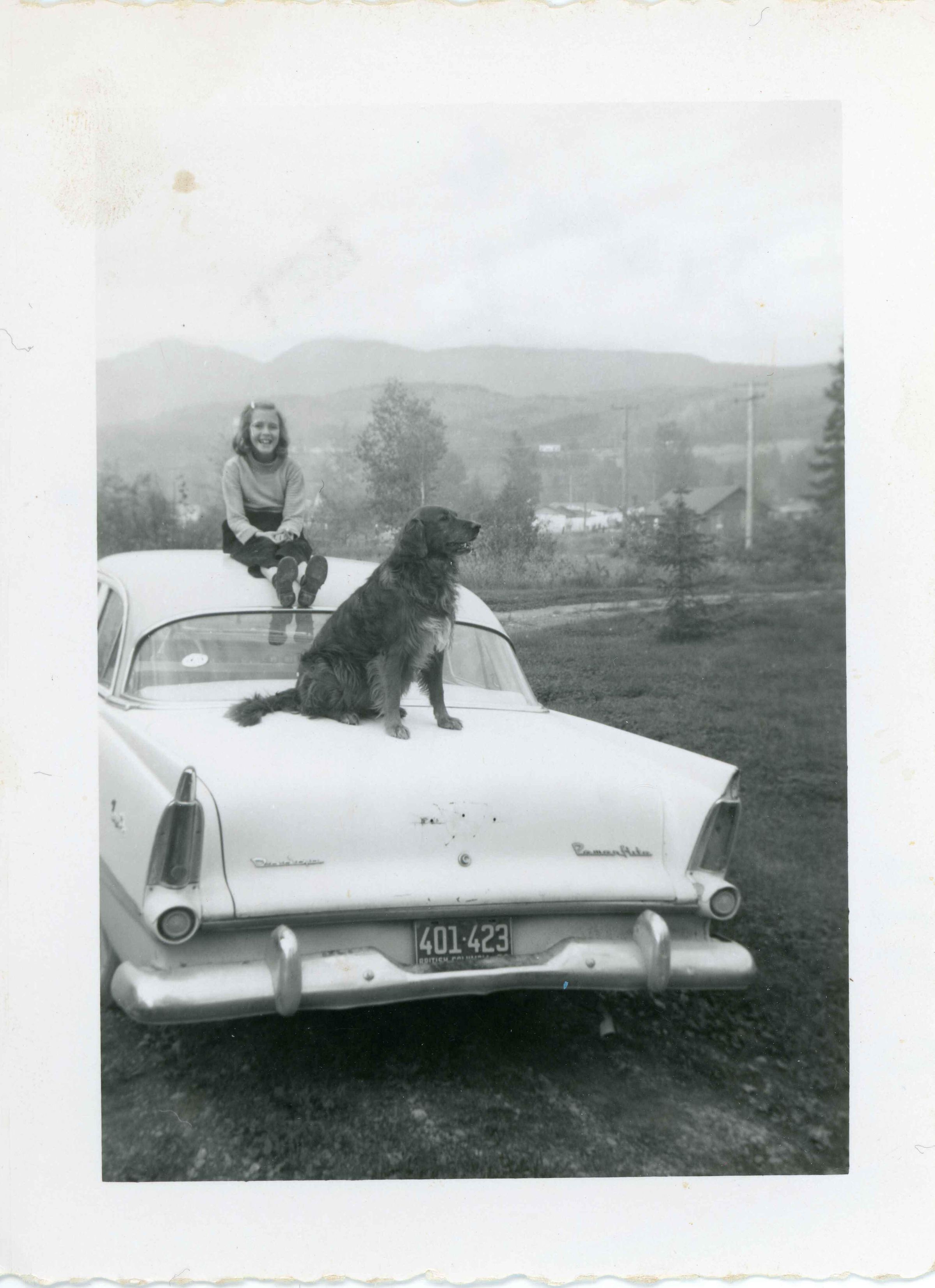 B+W photo of a girl sitting on a care, a dog is sitting on the closed trunkAcquisition
