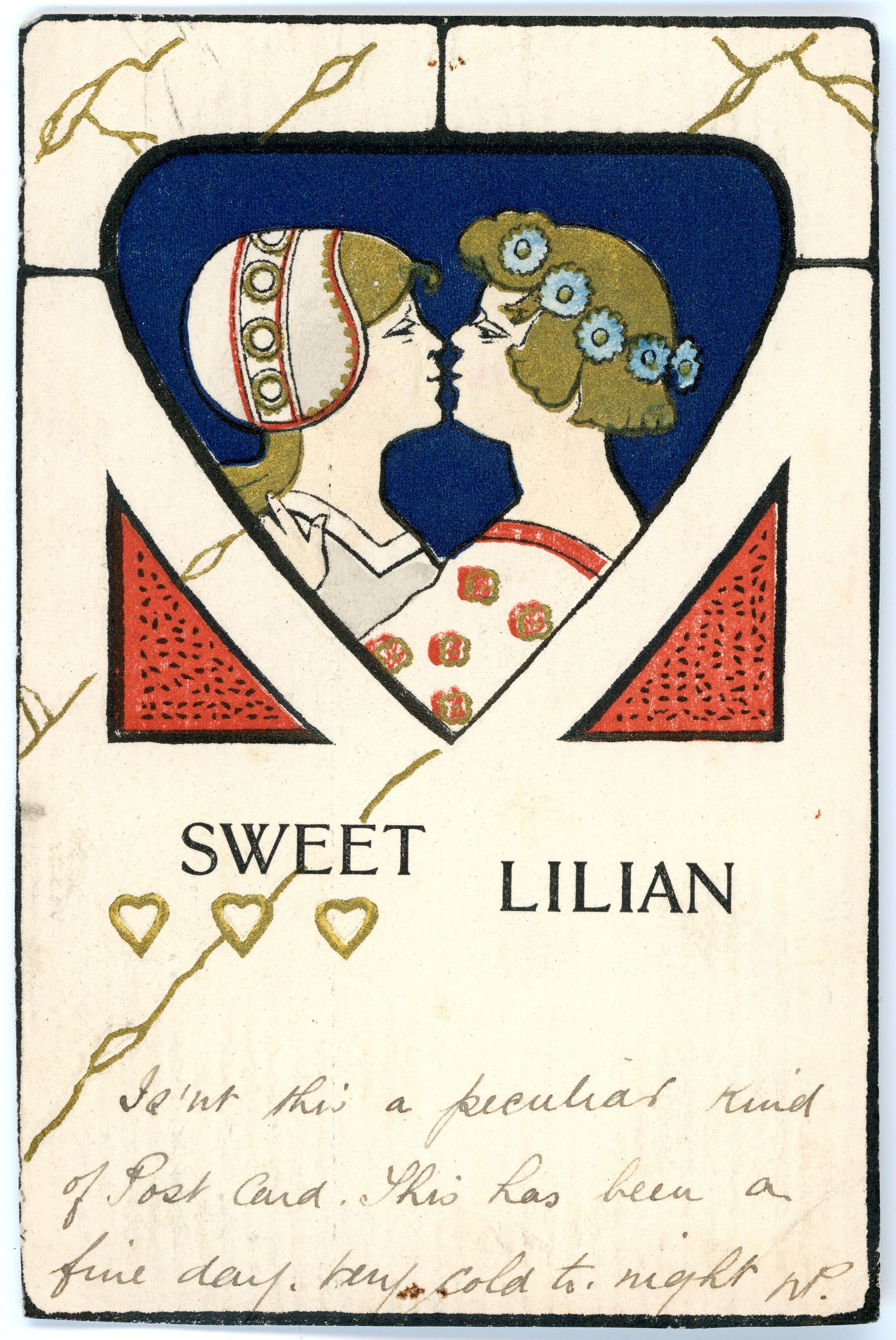 Postcard from 1904 of a couple kissing, the image is called Sweet LilianCollection