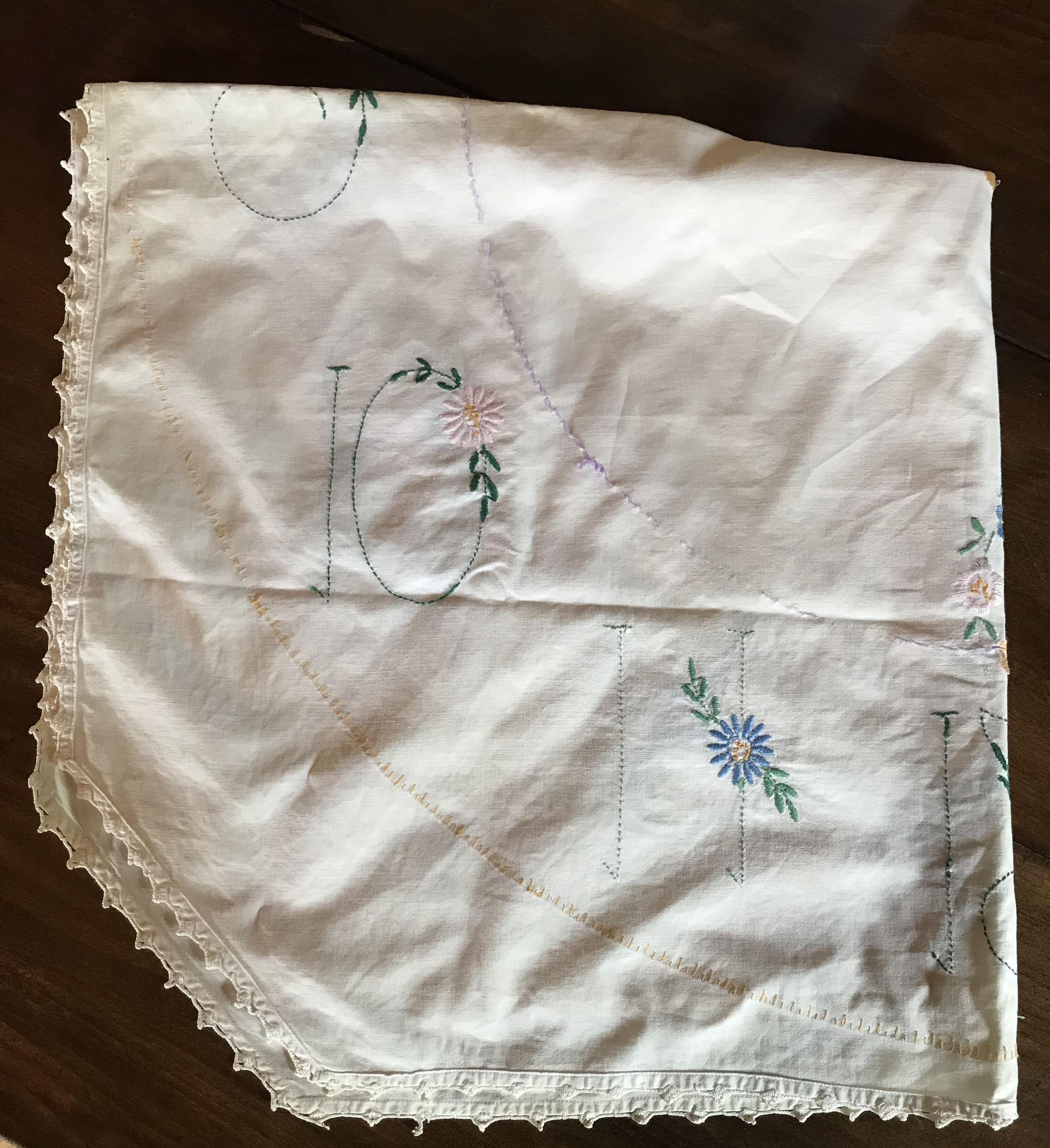 Hand embroidered cotton 36" tea cloth - clock design done by Vera Frank