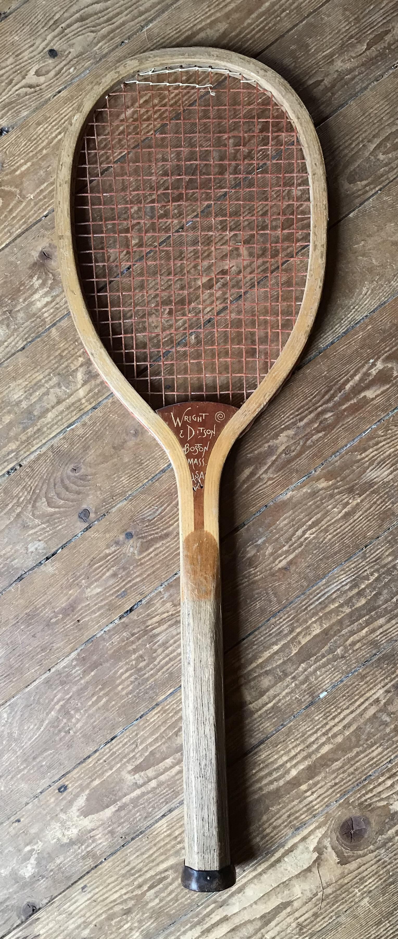 Tennis racquet circa 1908 owned by Clara (Beste) Little restrung in 1940.Use