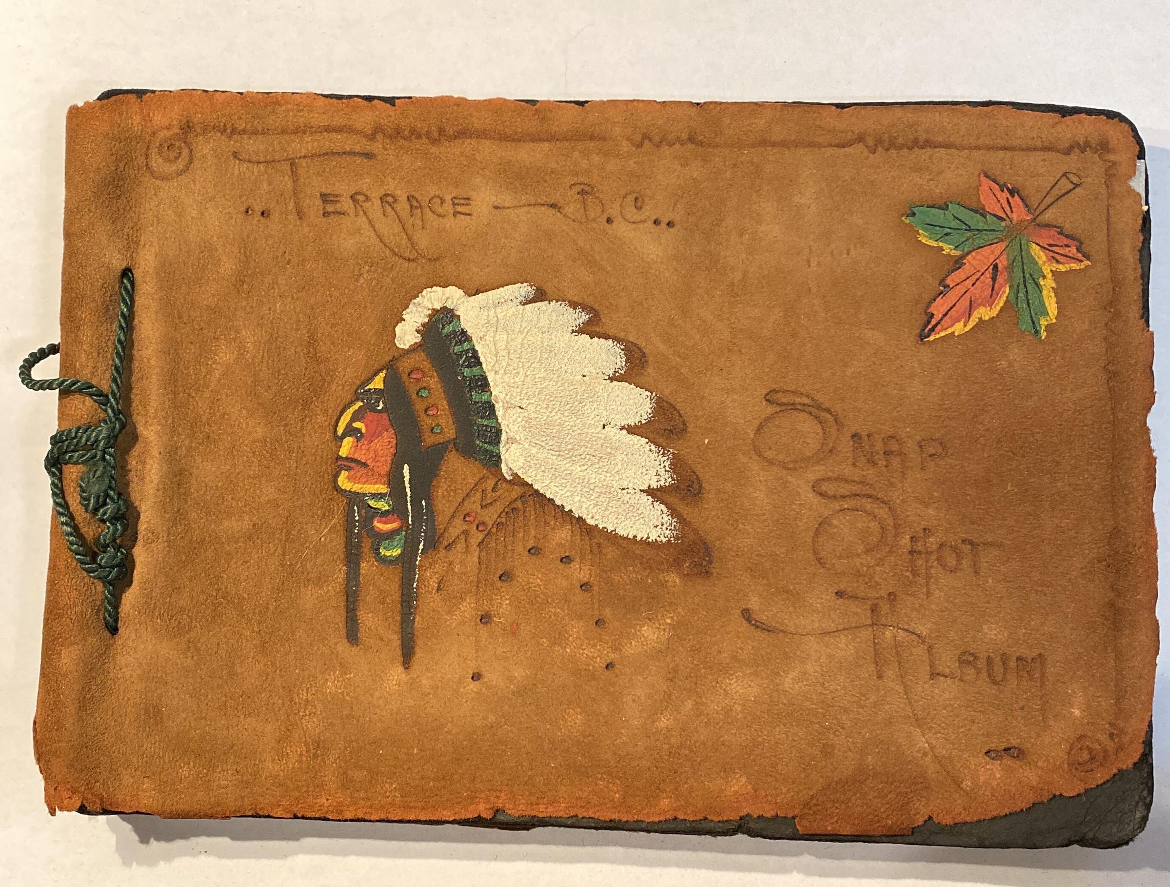 Photo album, all photos have been removed and given letters, some were kept by the Bulkley Valley Museum. Has leather covers and hand painted First Nations man in a headressAcquisition