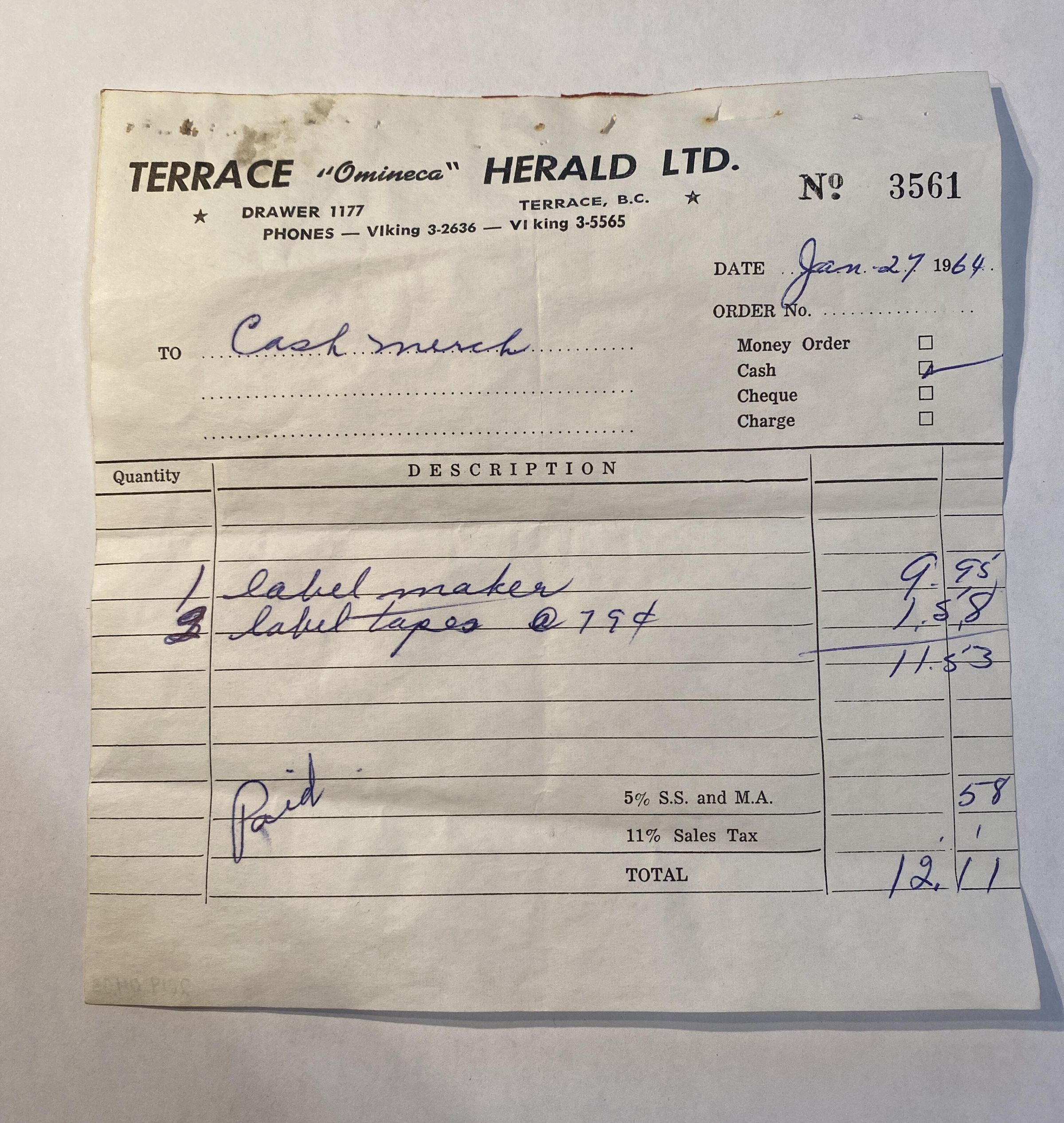 'Terrace "Omineca" Herald Ltd 1964' ReceiptEntry/Object ID