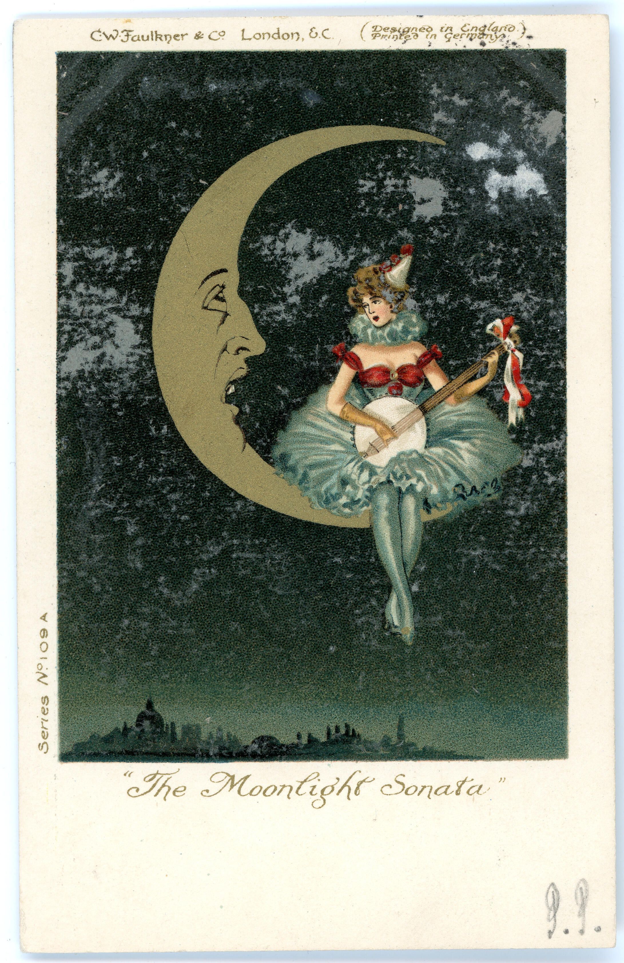 Postcard from 1903 of a women sitting on a cresent moon playing music for him. The print is called the Moonlight SonataCollection
