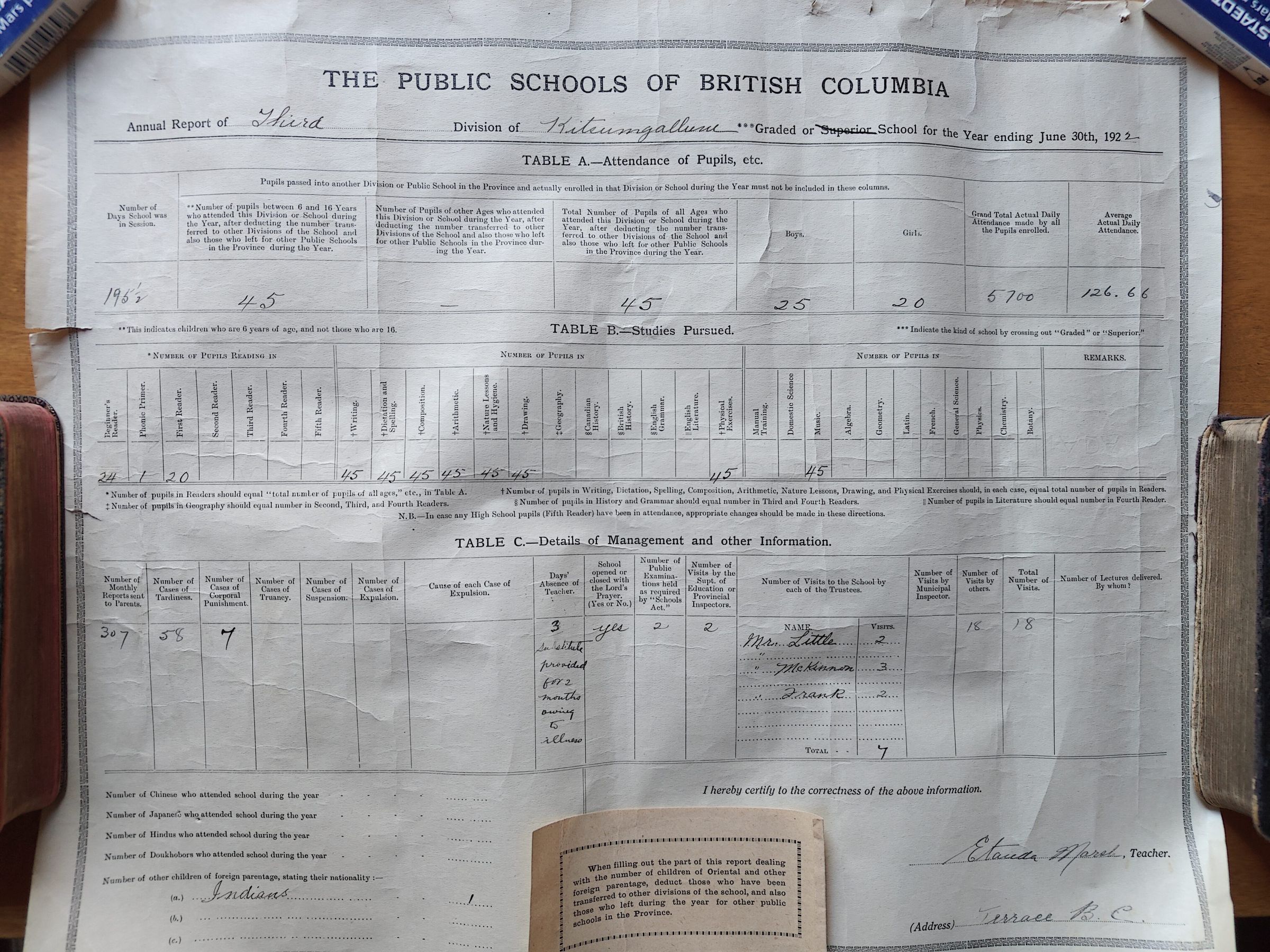 The Public Schools of British Columbia - Annual Report of Third Division of Kitsumgallum Graded School for the Year ending June 30th, 1922Description
