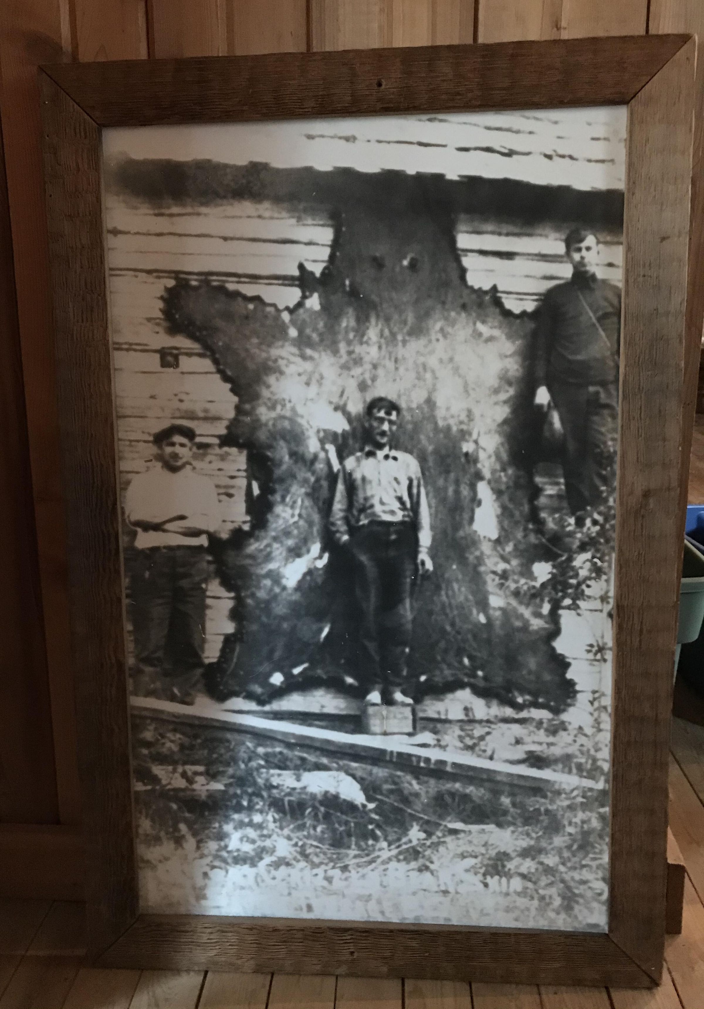 Cataloguer's Remarks: enlarged photograph of 3 men standing in front ot a 12 ft tanned bear hideAcquisition