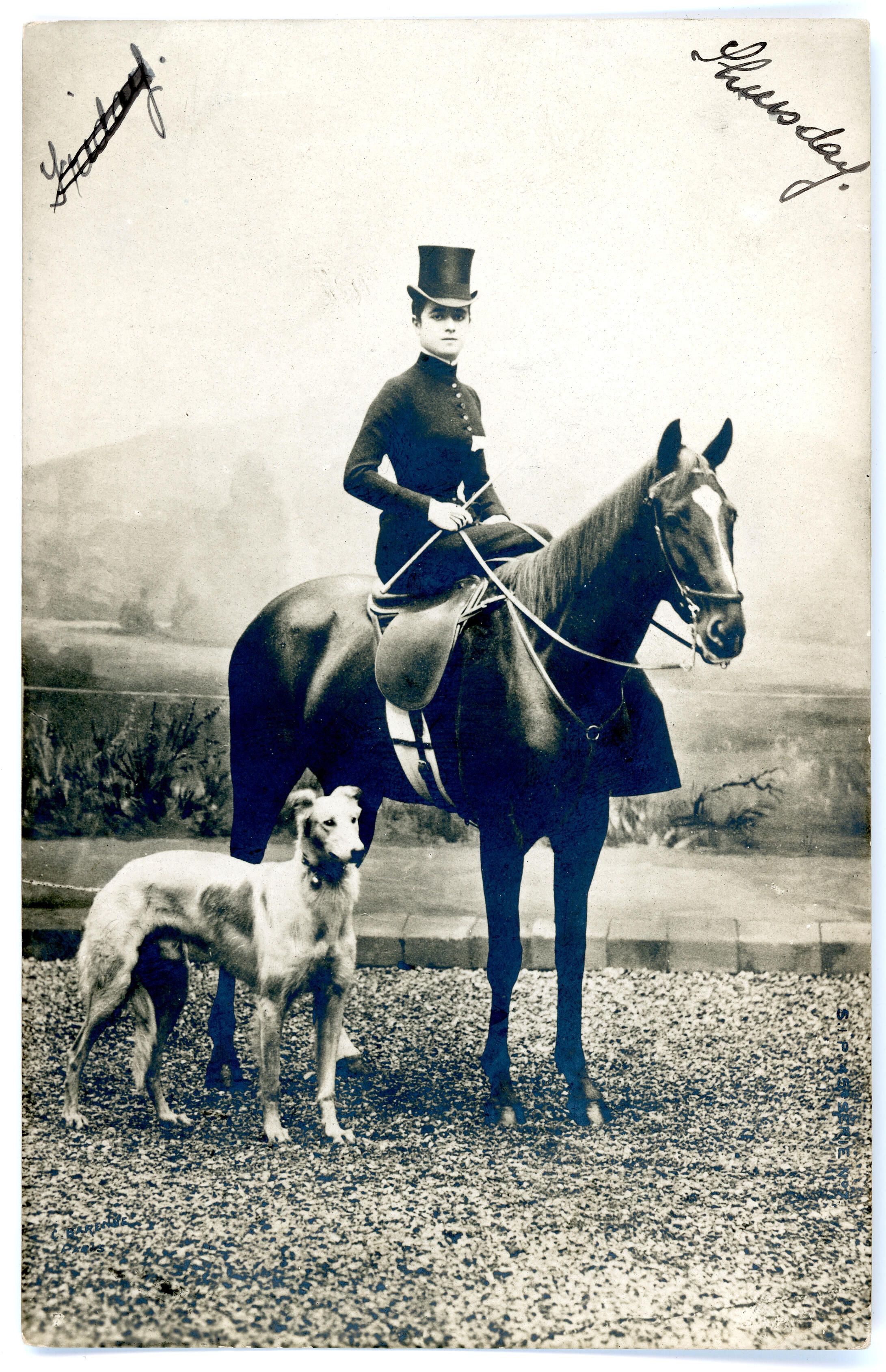 Postcard from 1903 of a women sitting side sadle on a horse with her dogCollection