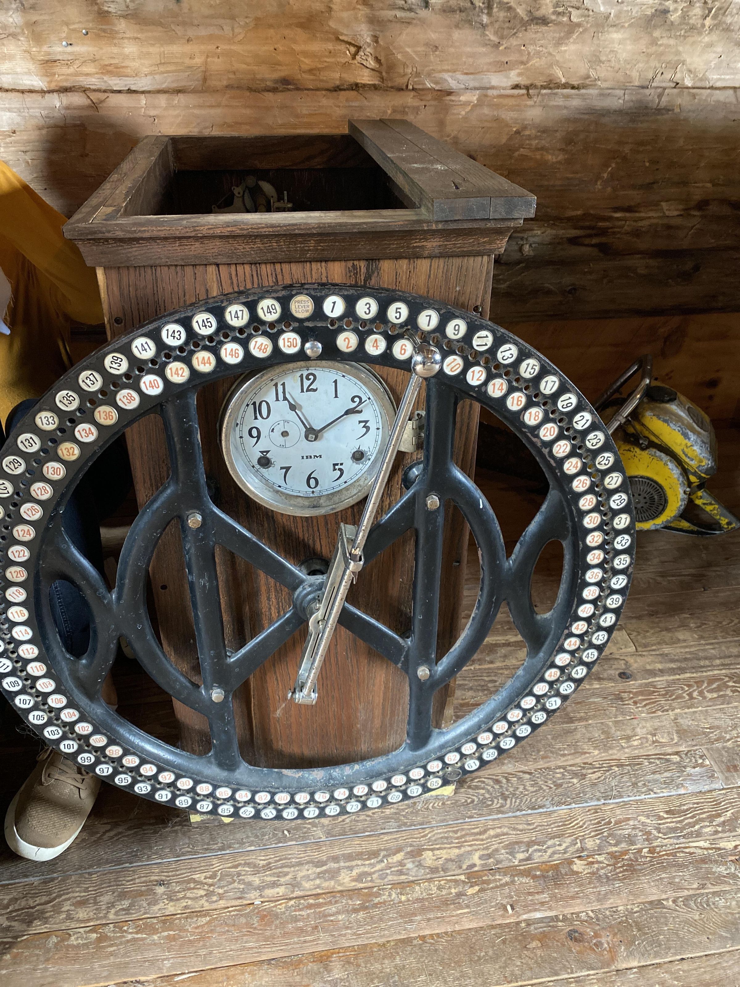 Time clock with 3 wood piece covers While cataloguing, paper was found inside clock from Pohle Lumber Co “Made in 1911 by IBM” - sample tour script: Working at Heritage Park Museum