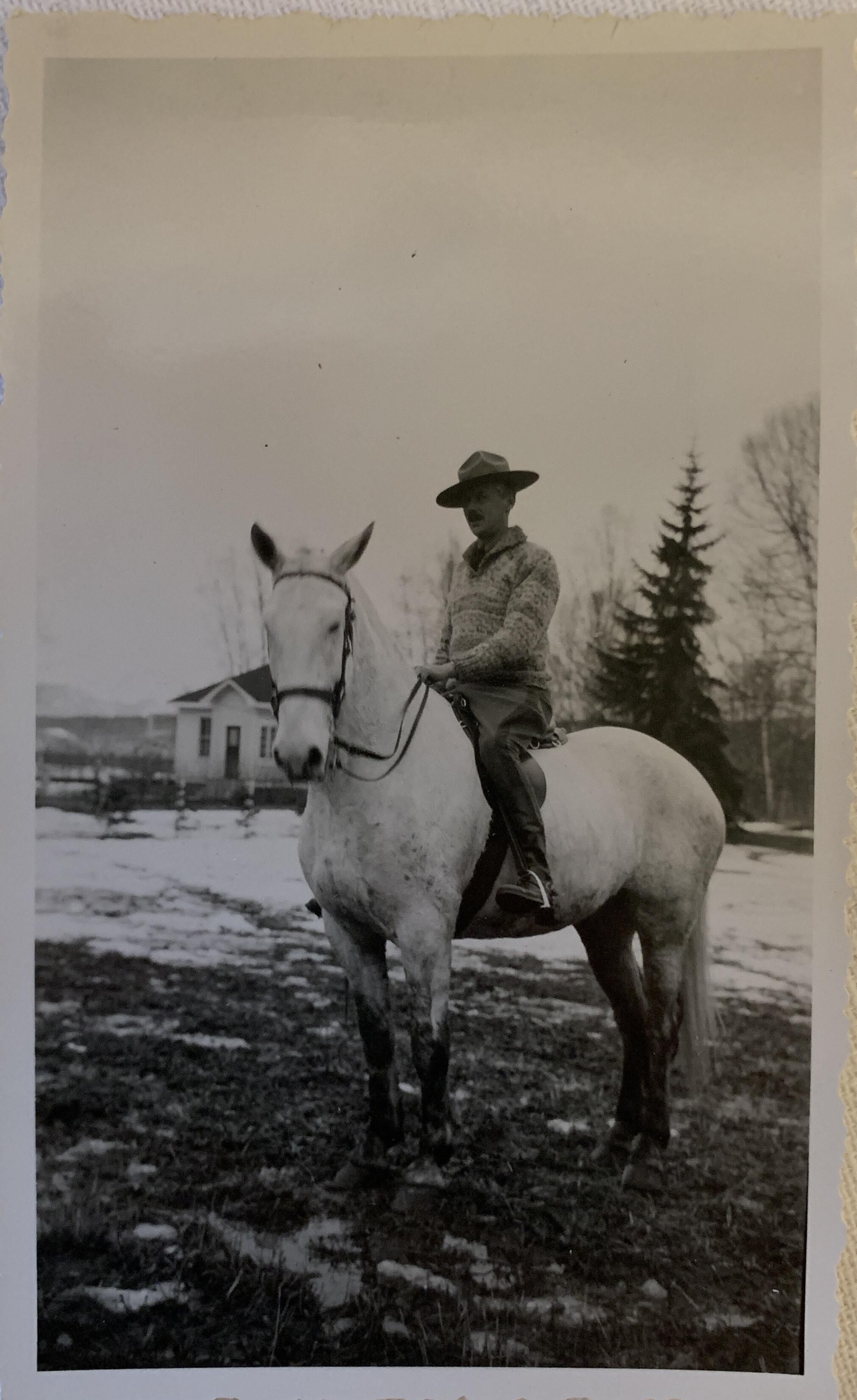 Tony West on Scandal (horse). White house in background. Hazelton, March 1945Photograph Details