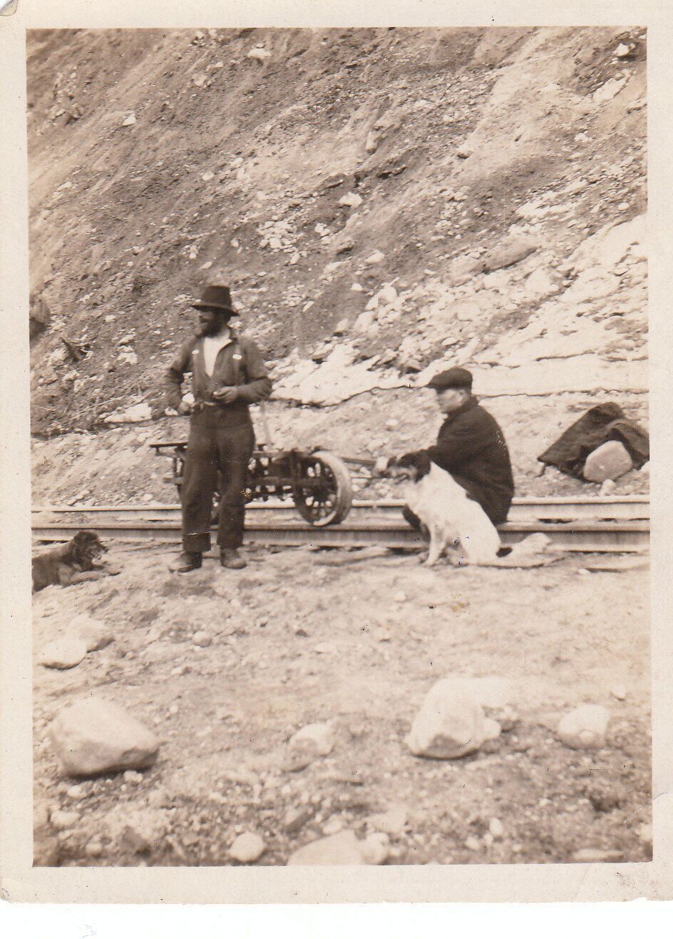 2 men and a dog sitting by the railway track. The location is unknown.Acquisition