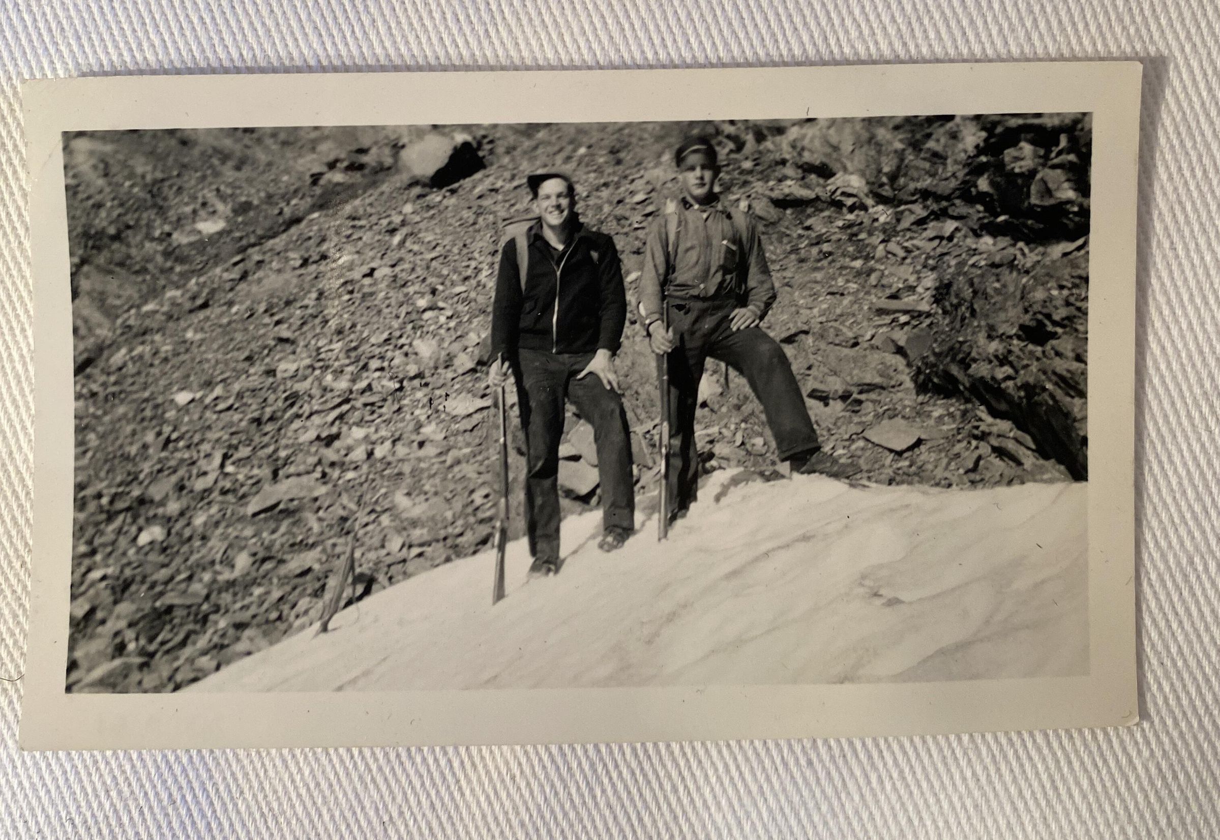 Black and white photograph of two men standing on a patch of snow holding guns, perhaps in Nass areaCollection