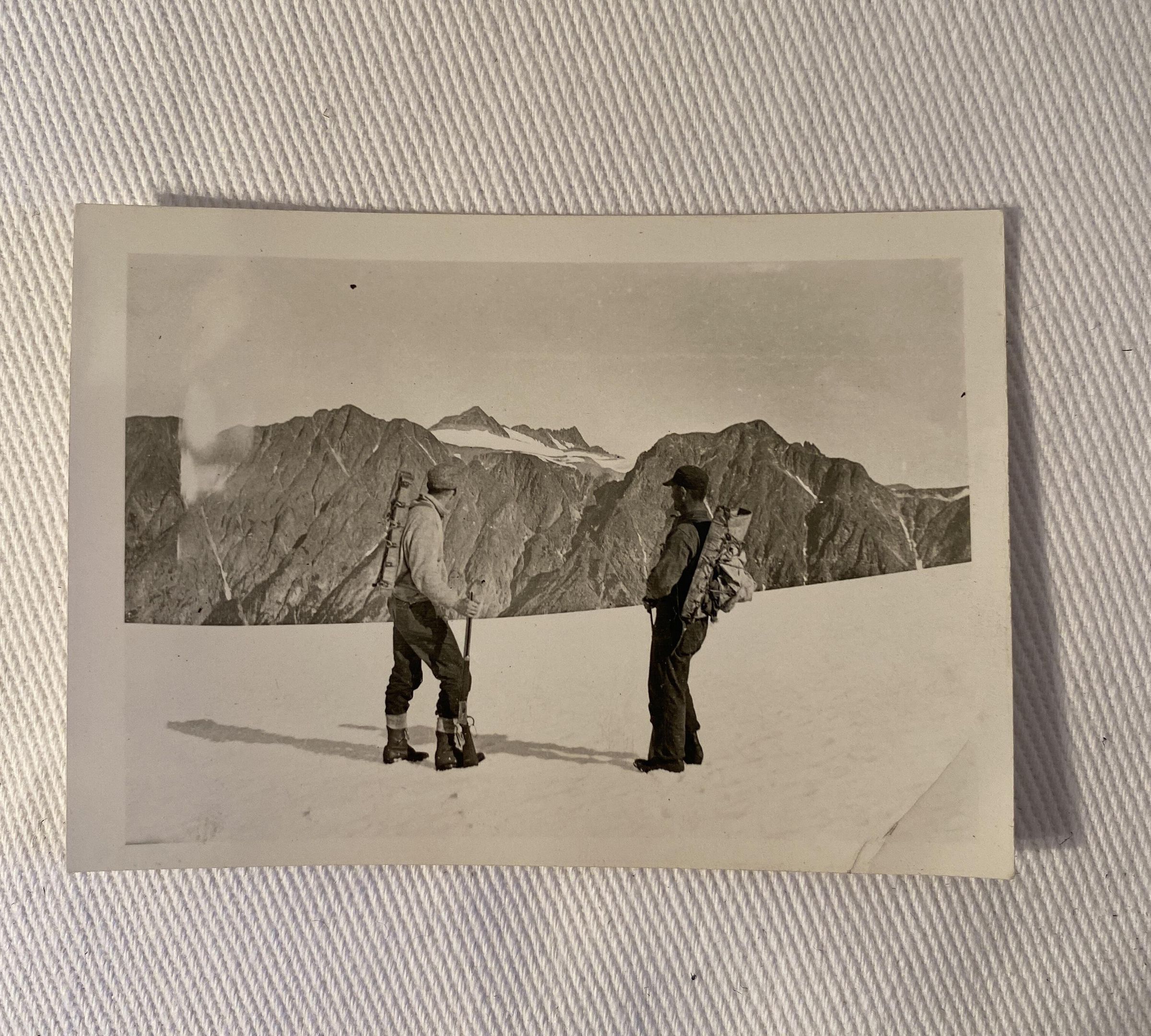 Black and white photograph of two men standing on a patch of snow looking toward a mountain holding guns, perhaps in Nass areaCollection