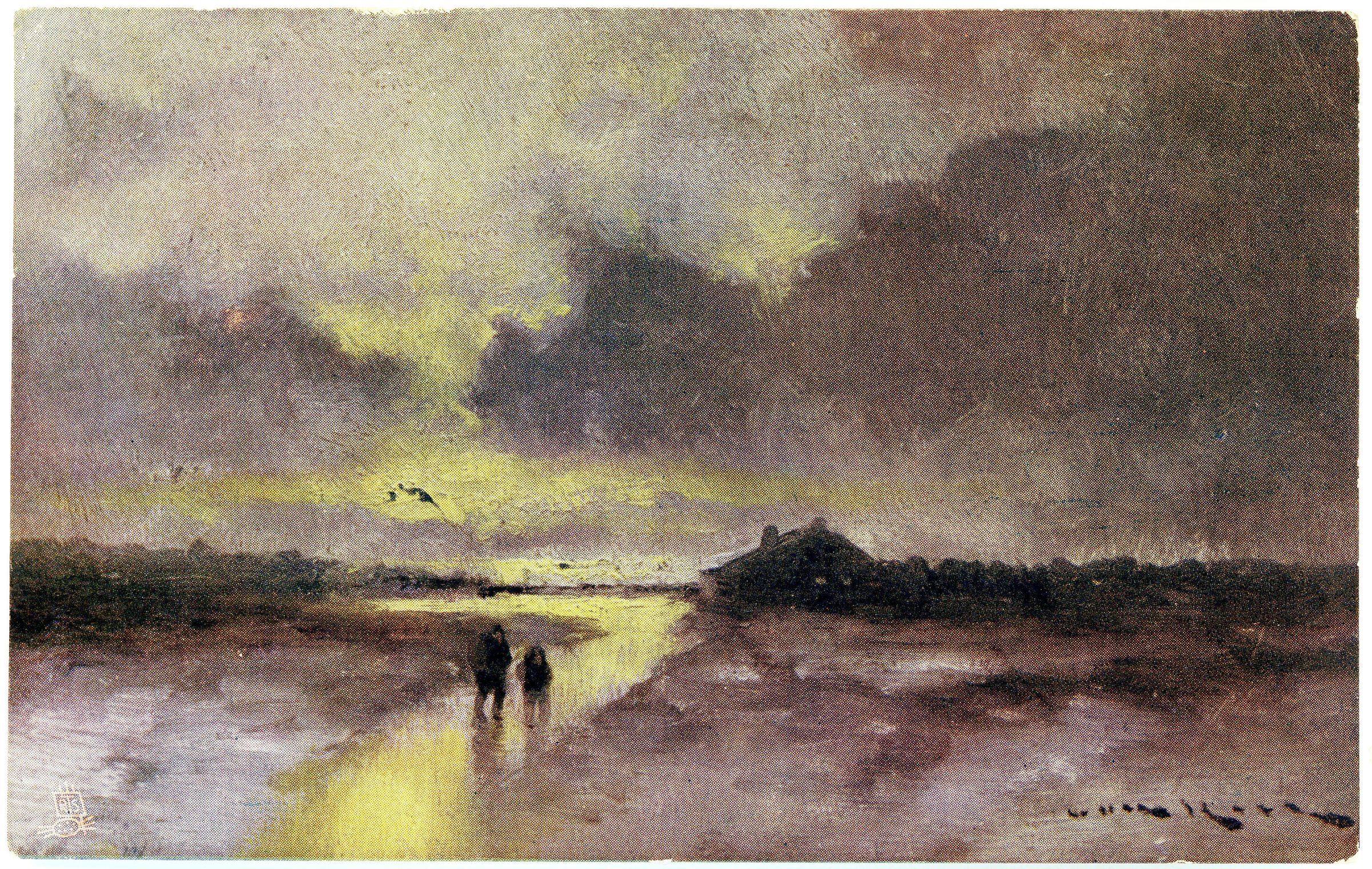 Postcard from 1904 of two people walking on a yellow road towards a cabinCollection