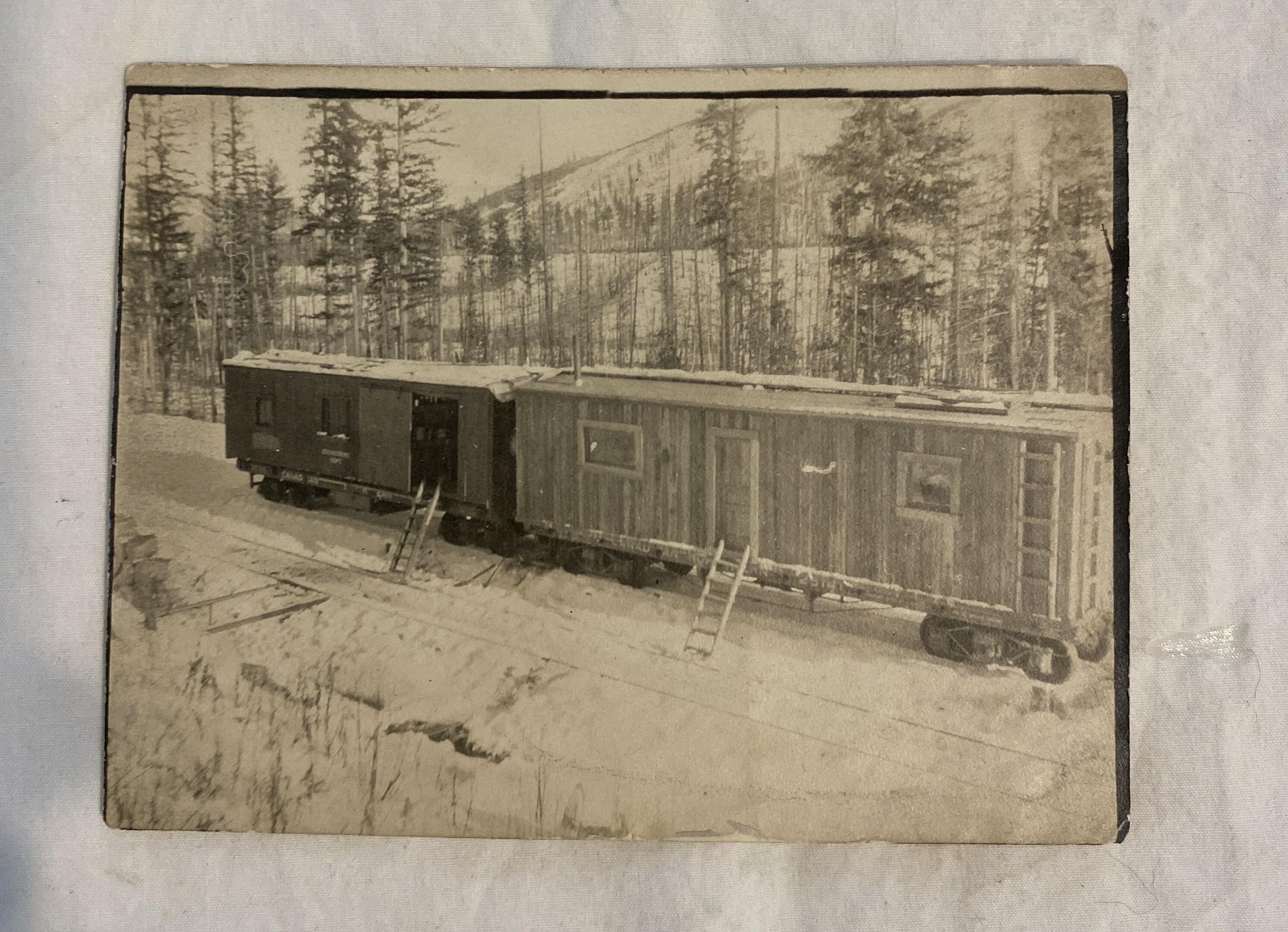 Black and white. 2 railway cars parked in the winter. Location is unknown.Acquisition