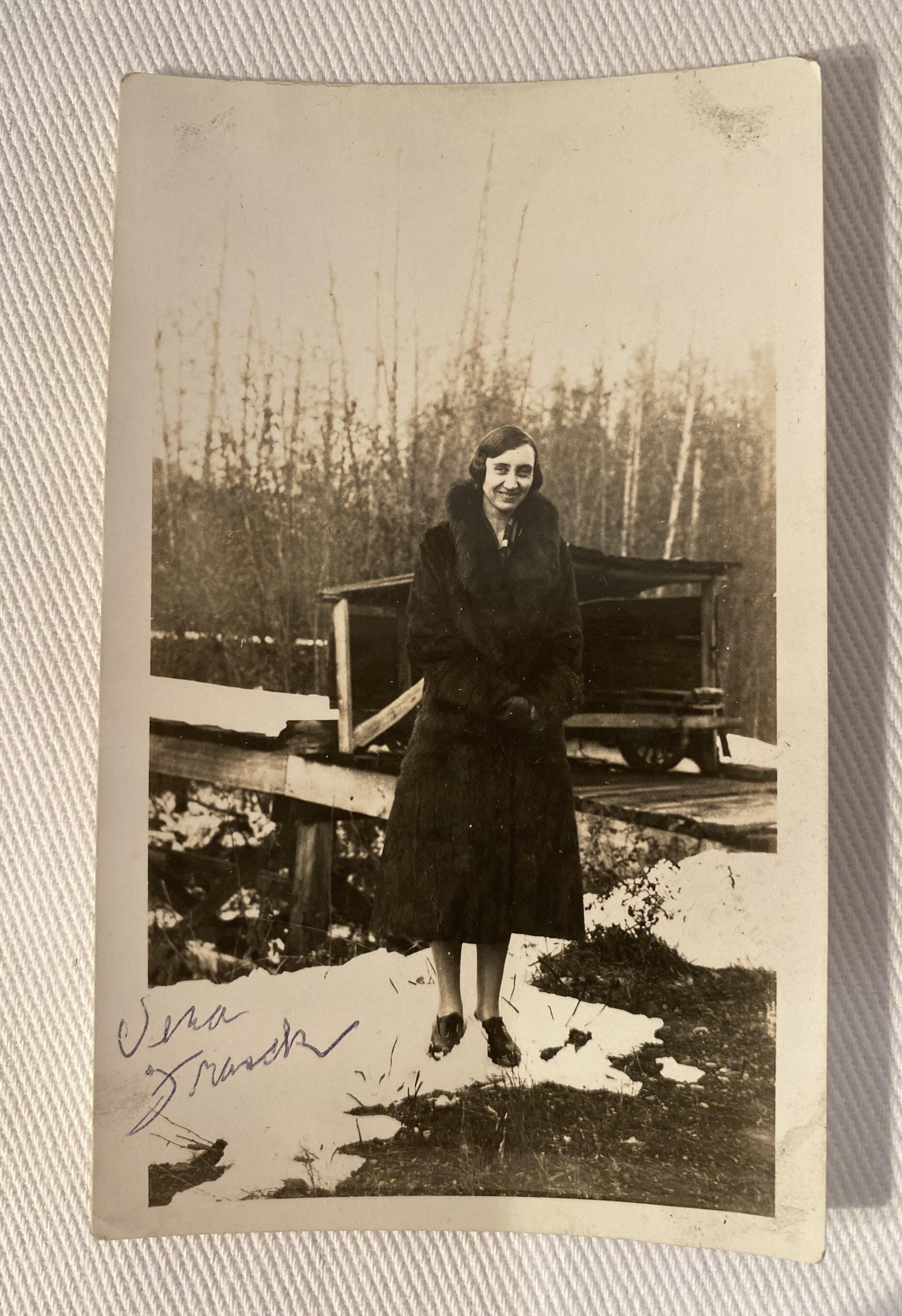 Black and white photograph of a woman wearing a fur coat. pen writing 'Vera Frank' in right cornerPhotograph Details