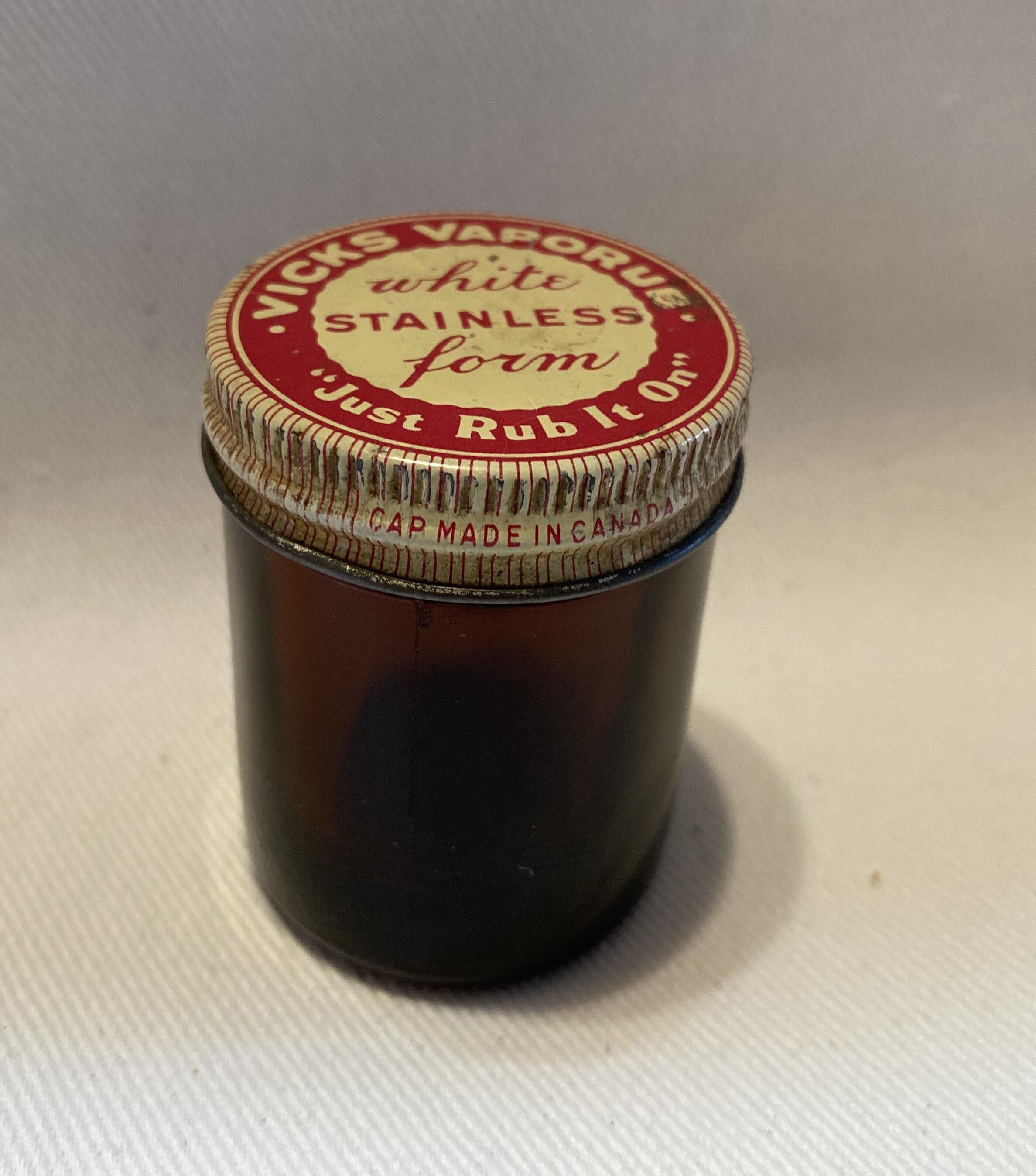 Vicks Vapour Rub, white stainless form jar. Brown glass with a beige and red screw on lid.Use