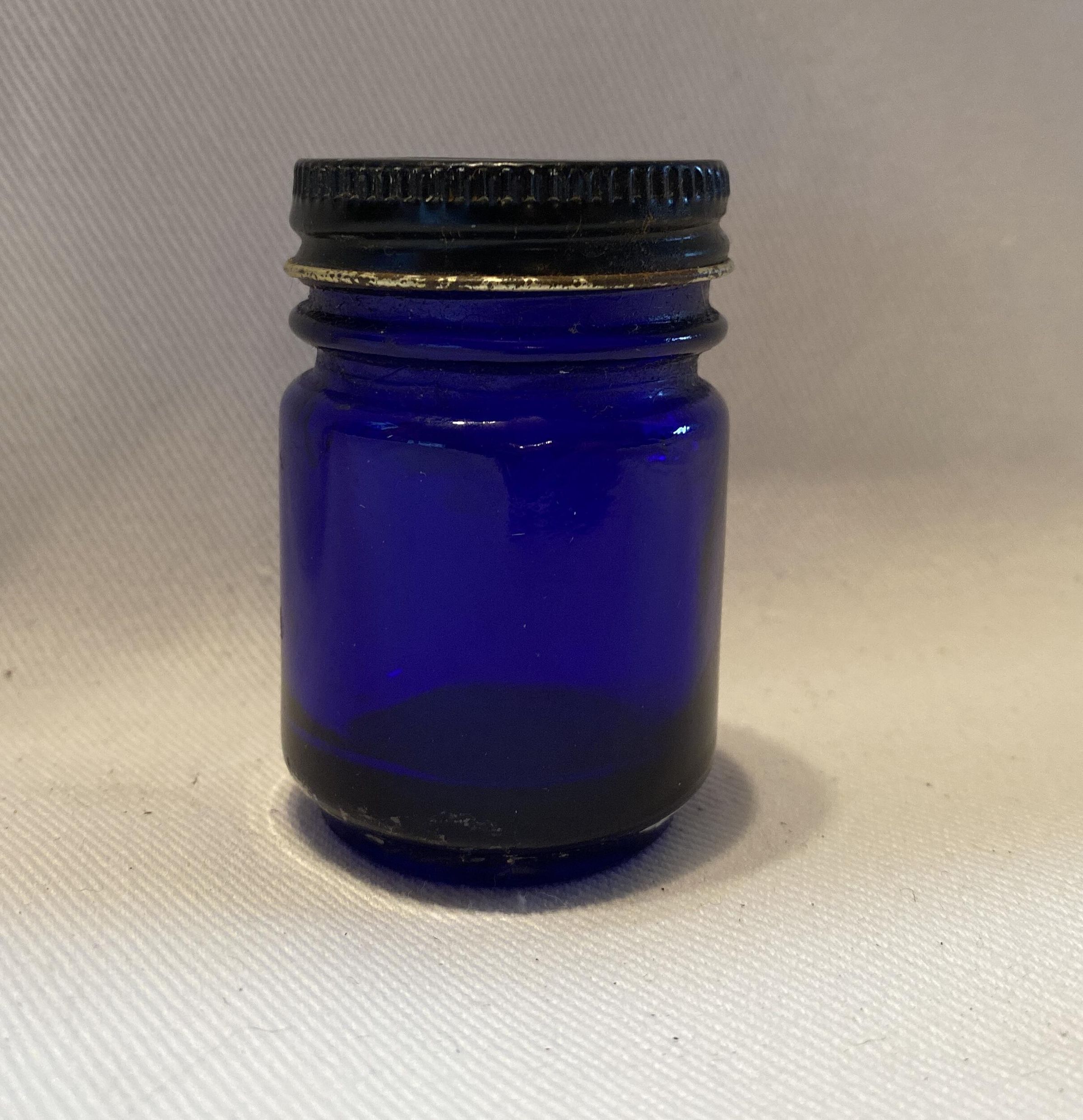 Vicks Vapour Rub Jar. Blue glass jar with black metal screw on lid
