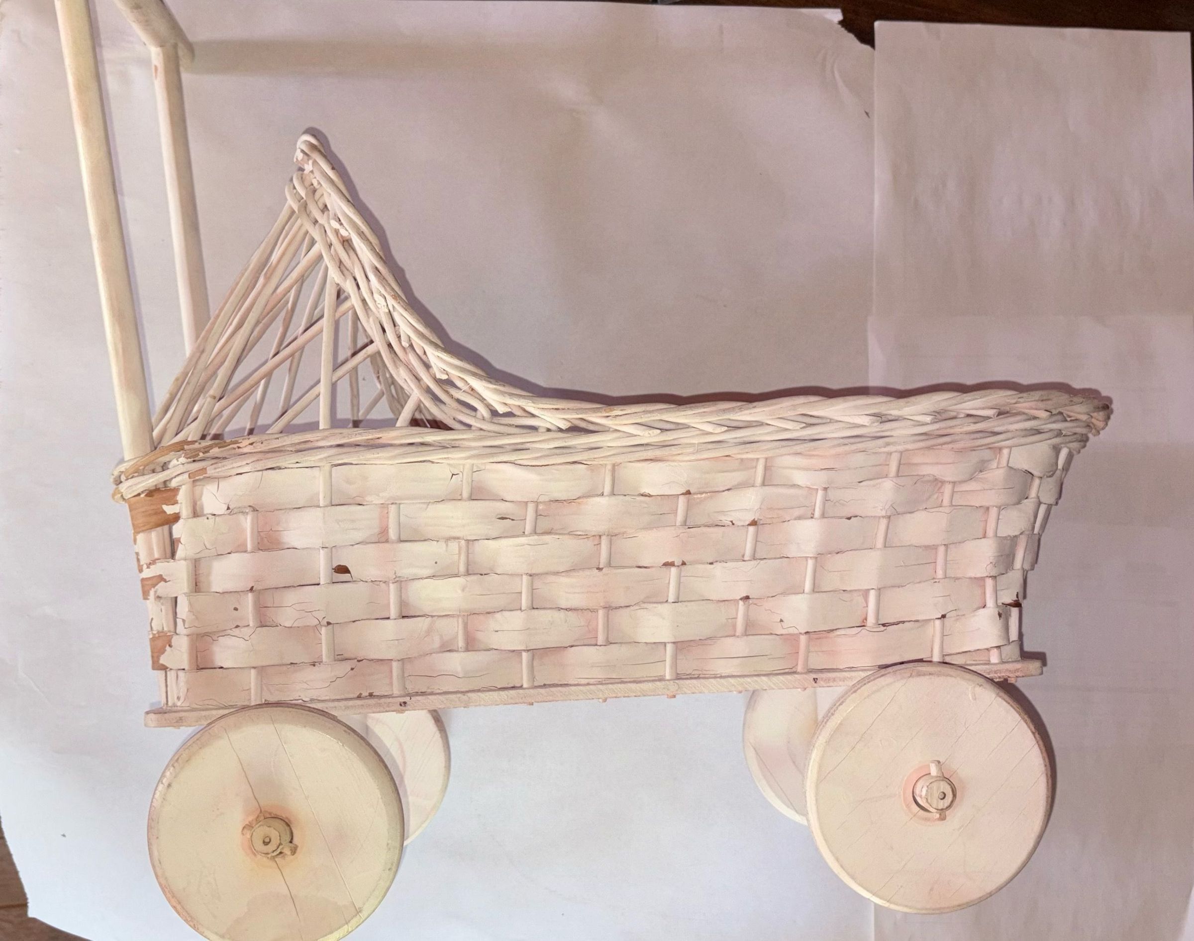 This is an old white wicker baby doll carriage stroller. Based on similar items, this carriage is most likely from the 60’s. Inside is a baby blanket with foxes on the print and a ruffled edge.Context