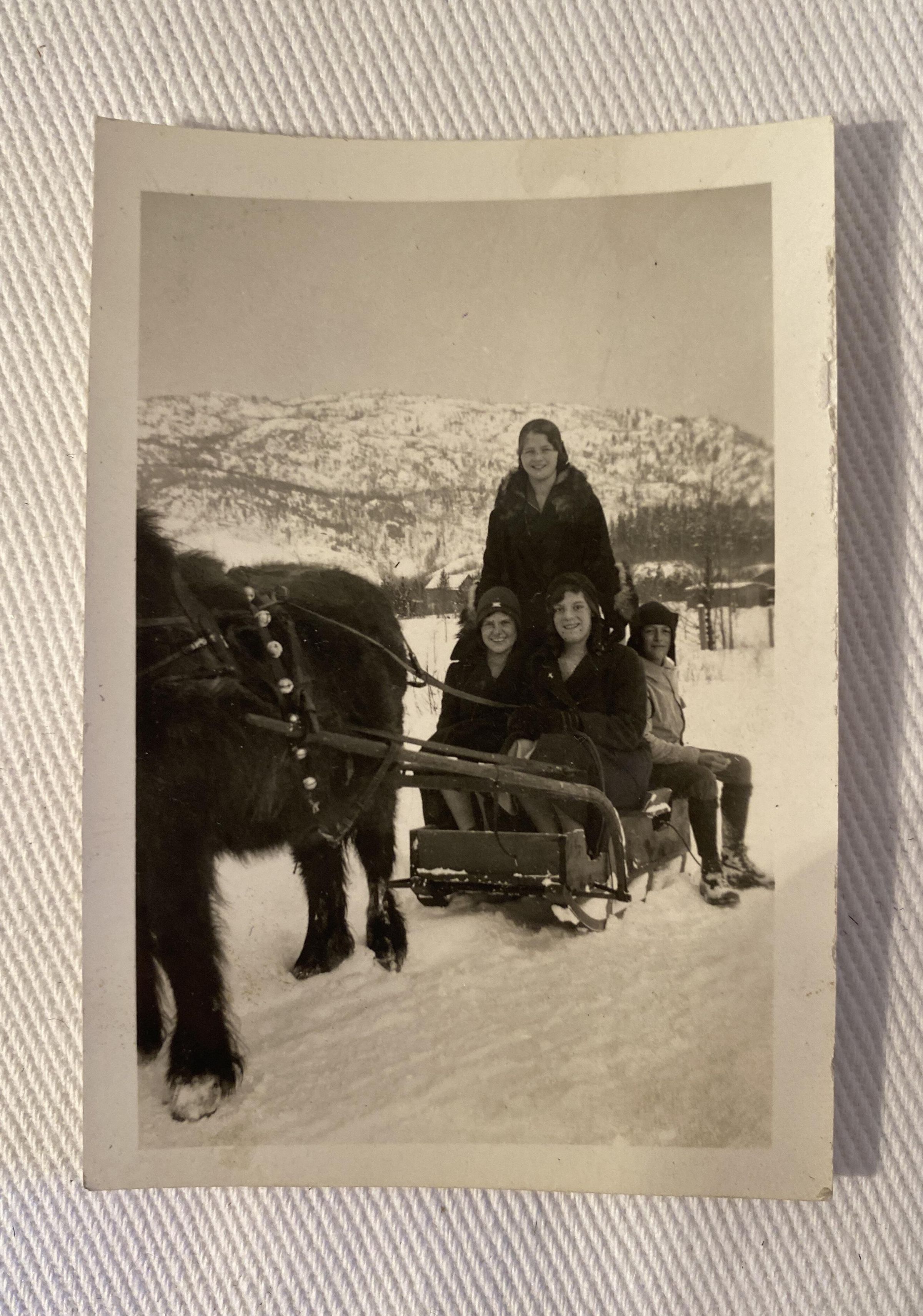 Black and white photograph of two girls and a boy sitting on a sled being pulled by a horse, one girl is standing on the sleigh. It is winter and snow is on the ground.Collection