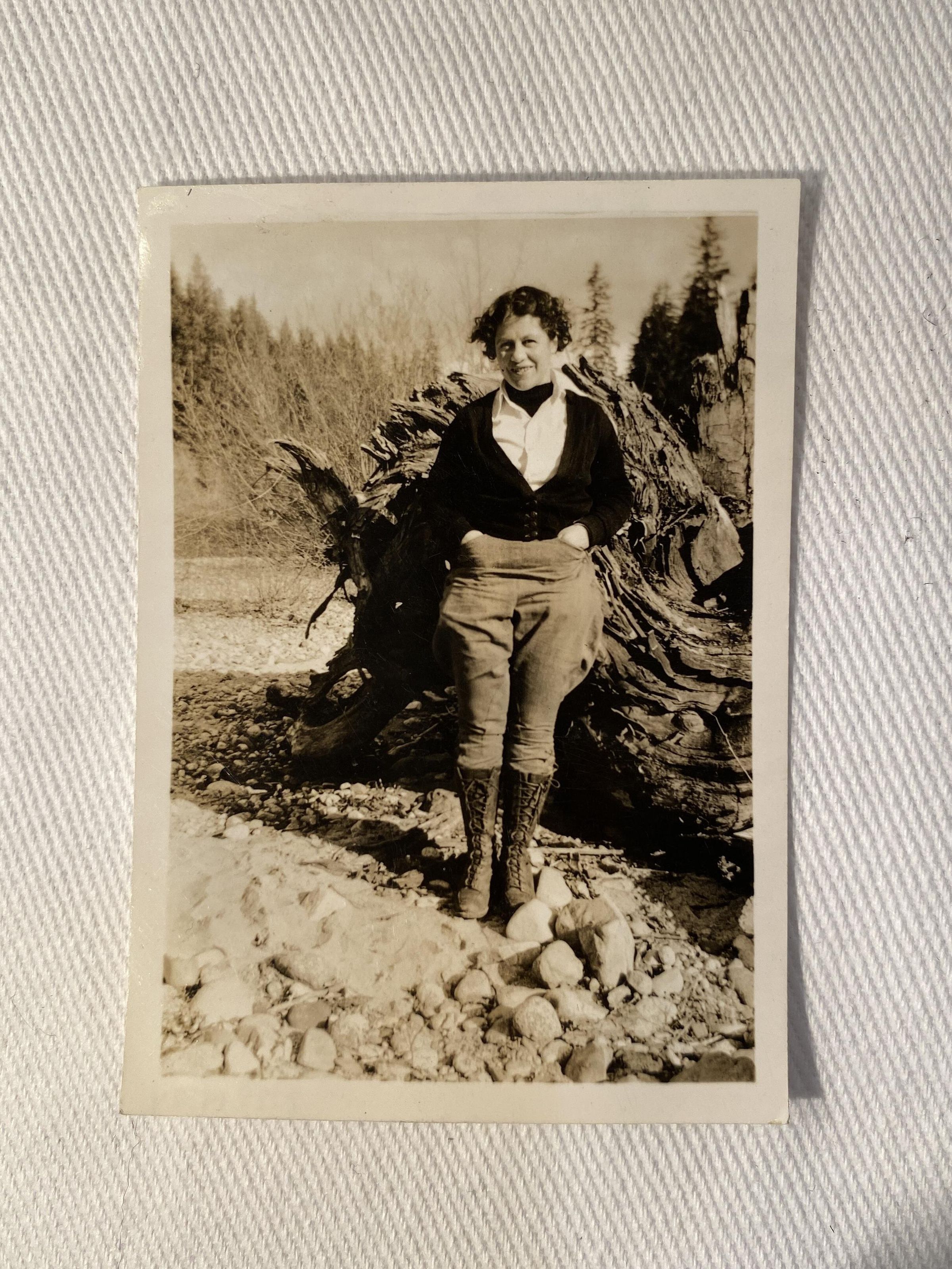 Black and white photograph with sepia tint of a woman wearing riding pants standing in front of a fallen tree and rocks, looks like the river bankCollection