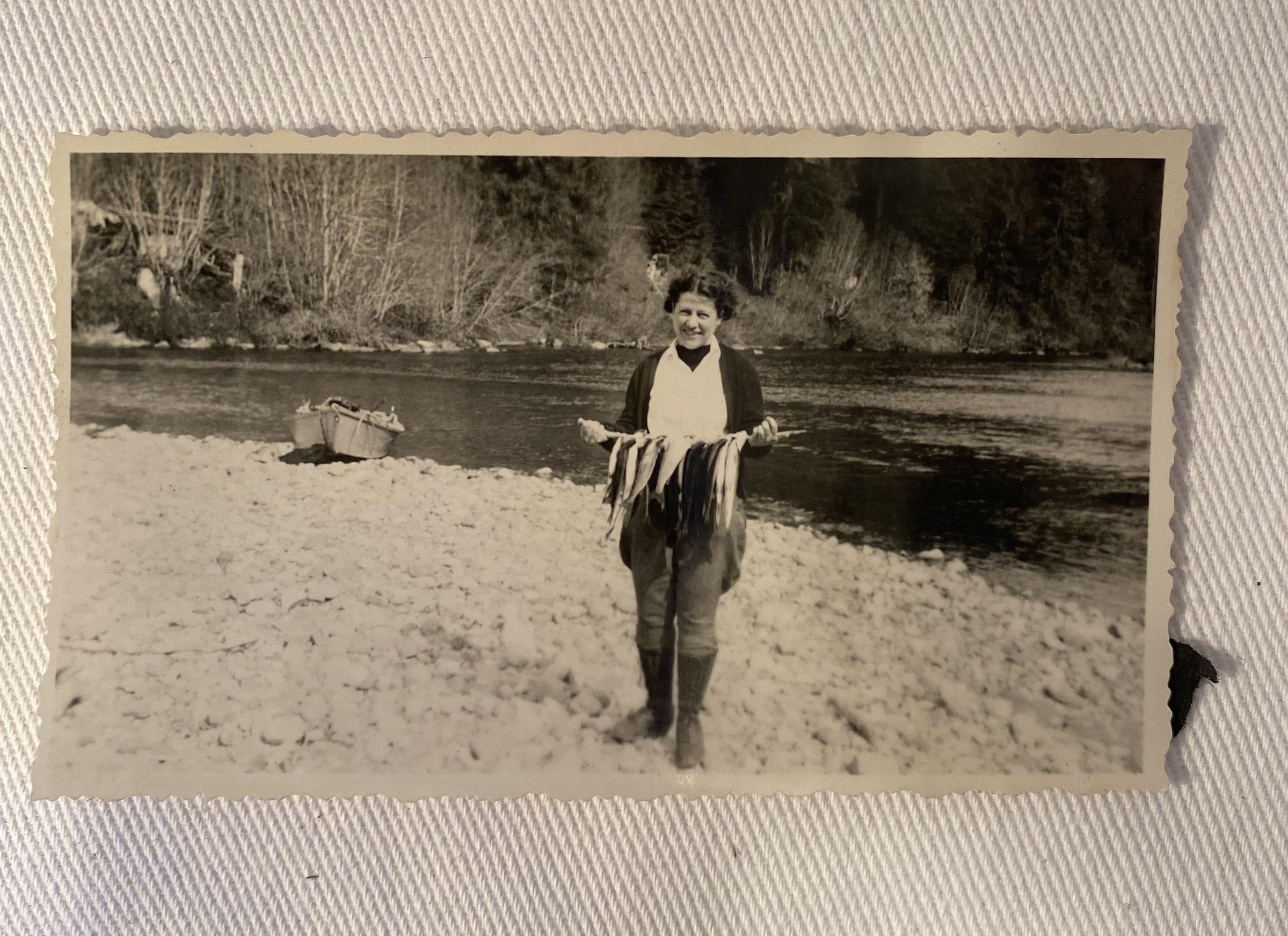 Black and white photograph of a woman holding a string of fish standing on a riverbank. Boat is pulled up on riverbankCollection