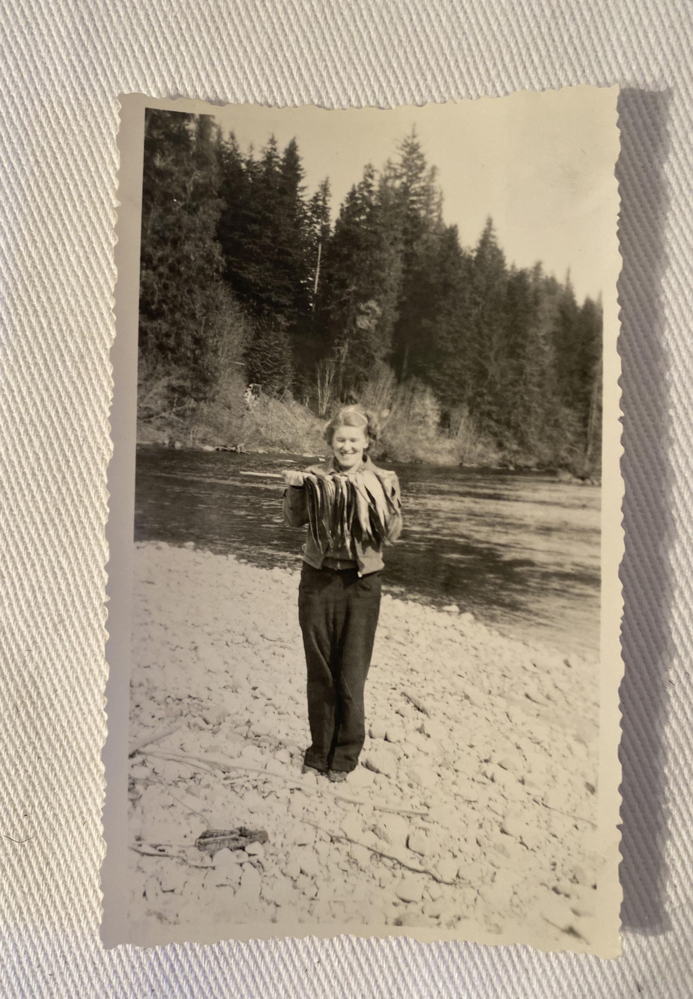 Black and white photograph of a woman holding a string of fish standing on a riverbank.Collection
