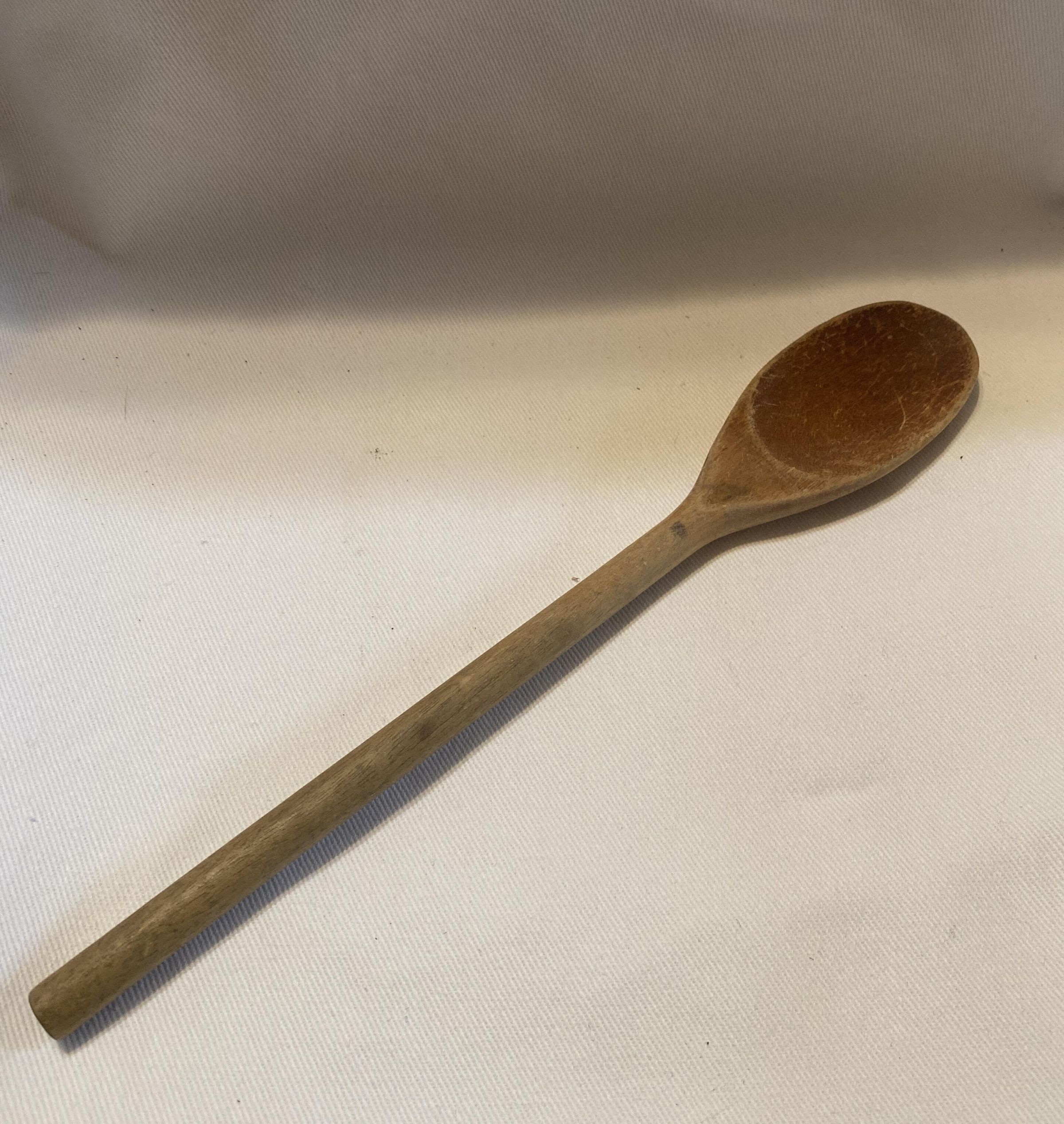 small wooden mixing spoon. The wood on the actual spoon has blackened but the handle is still the original wood colour.Acquisition