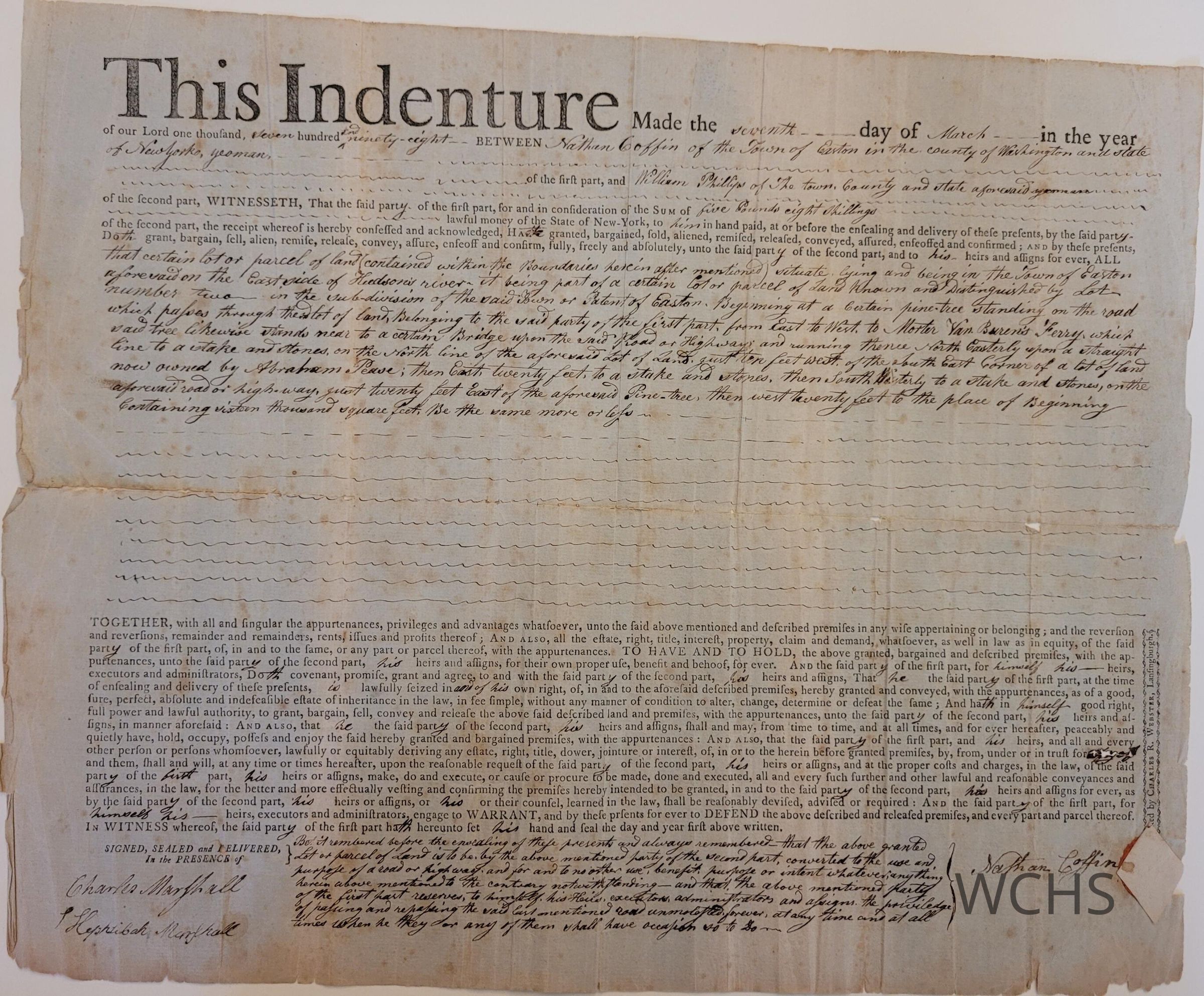 This indenture (contract) describes the land transfer between Nathan Coffin of the town of Easton and William Phillips of the town of Easton. Signed March 7, 1798. A high quality photocopy is included