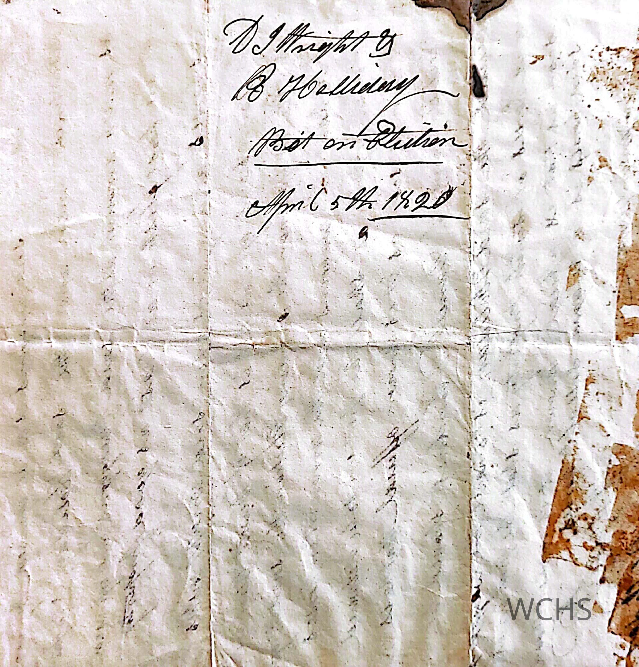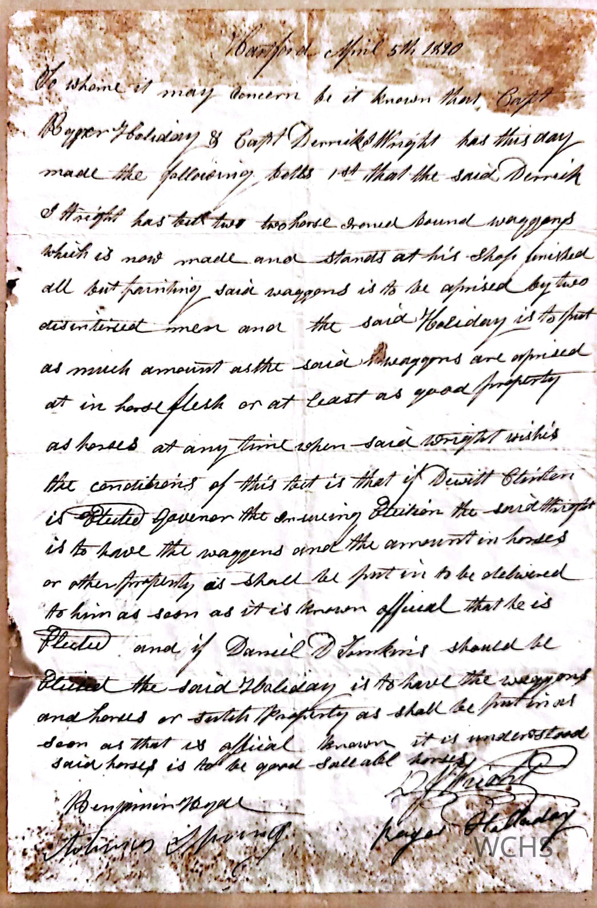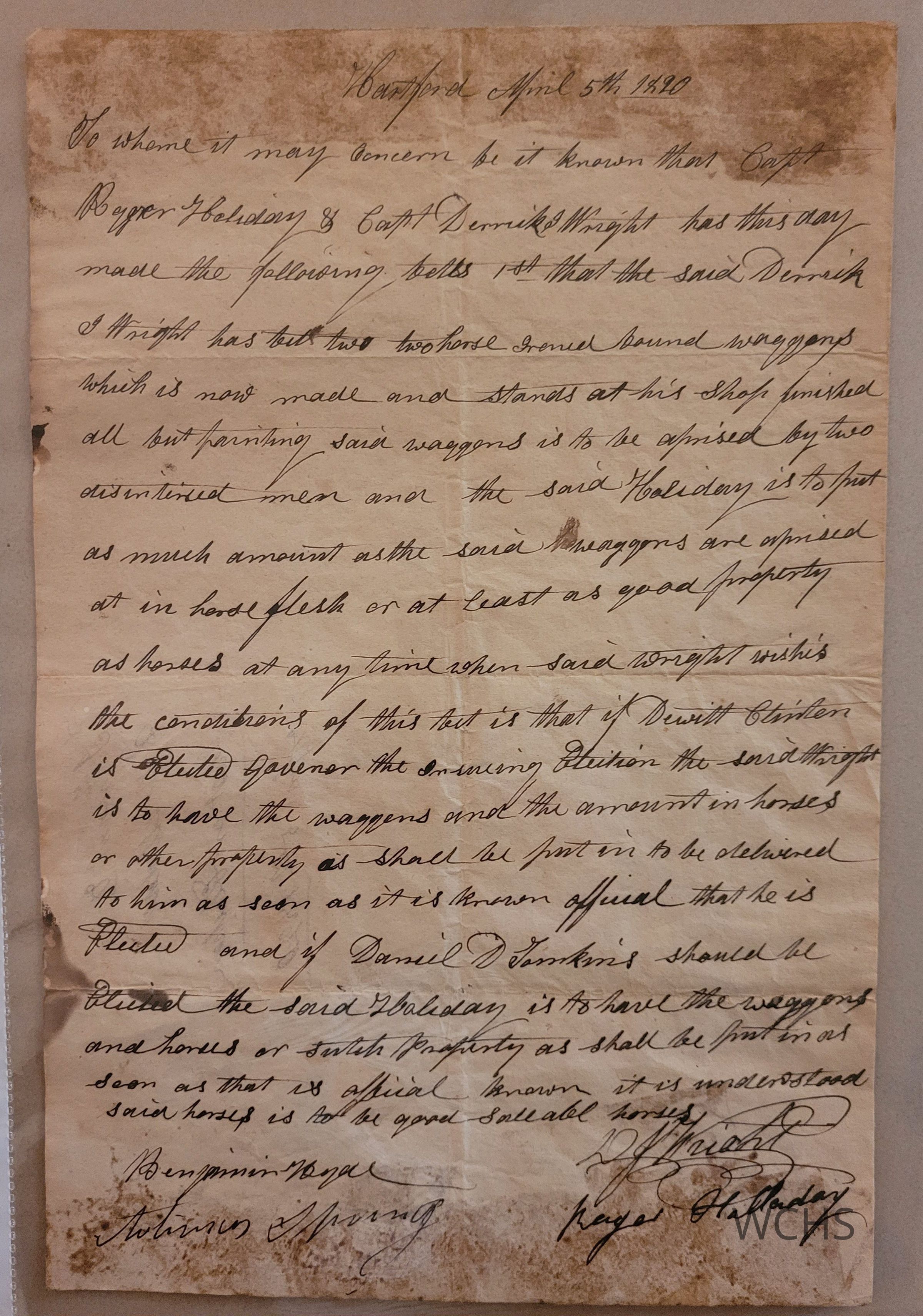 A wager agreement between Roger Halladay (Haliday) and Captain Derrik J Wright on April 5, 1820- both of Hartford, New York. The bet concerned the outcome of the NYS Govenor election. Wright wagered wagons and Halladay wagered horses. Captain Derrik won the bet when DeWitt Clinton won the election.